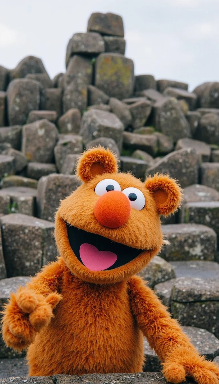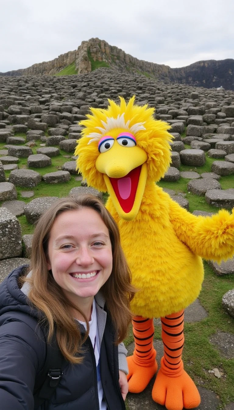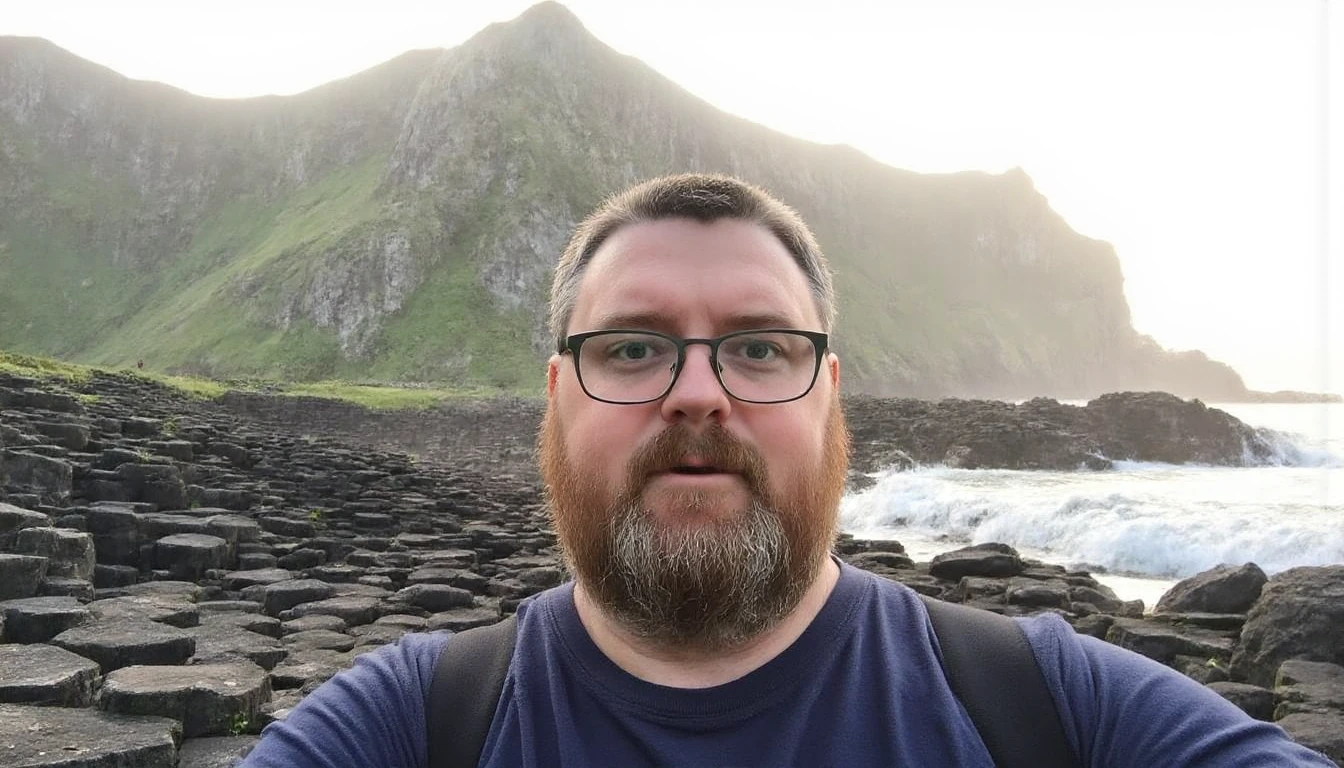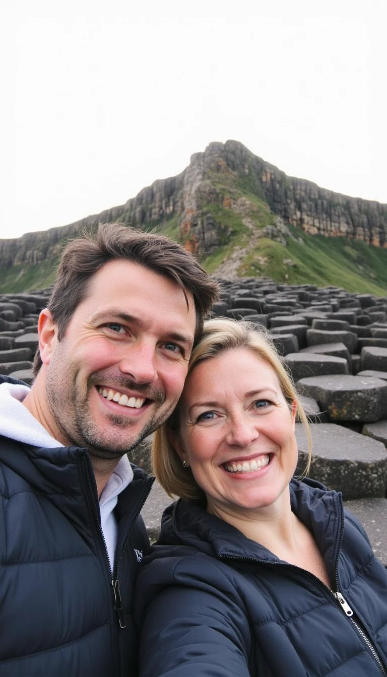 "g14nt, tourists taking selfies at giant's causeway, unique rock formations, landscape photography"
