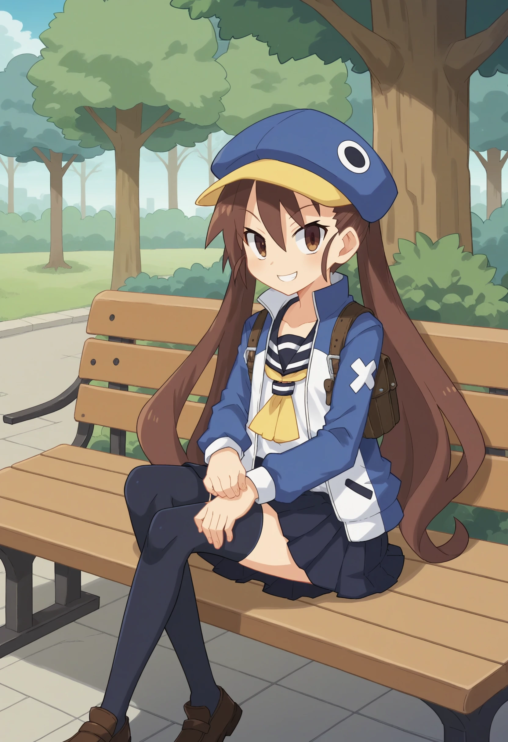 Base outfit - skirt, thighhighs, open jacket, school shirt, track jacket, necktie, school uniform, backpack, loafers, blue headwear,