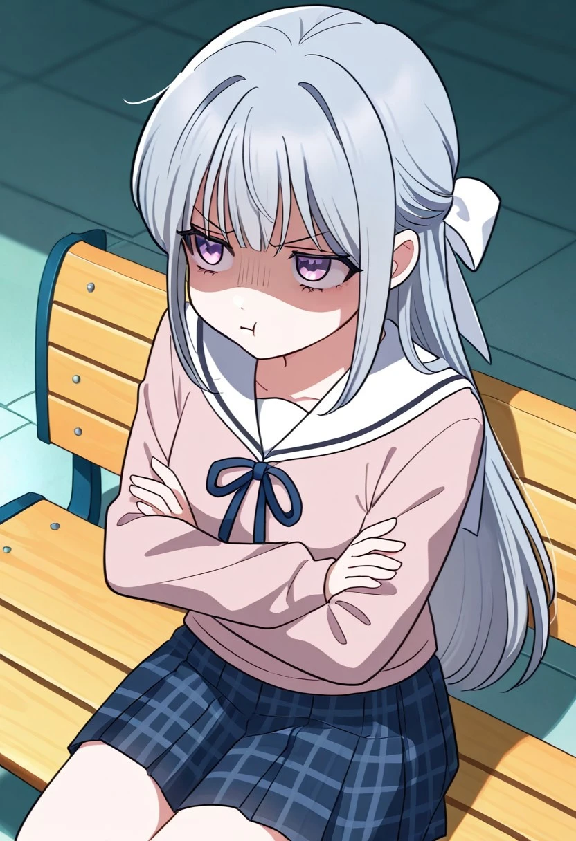 school outfit, white hair ribbon, light-pink long-sleeved sailor-style blouse, dark blue plaid pleated skirt,
