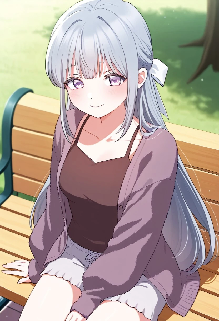 main outfit, white hair ribbon, fluffy long-sleeved dark-purple cardigan, cardigan worn open, white loose-fit shorts,