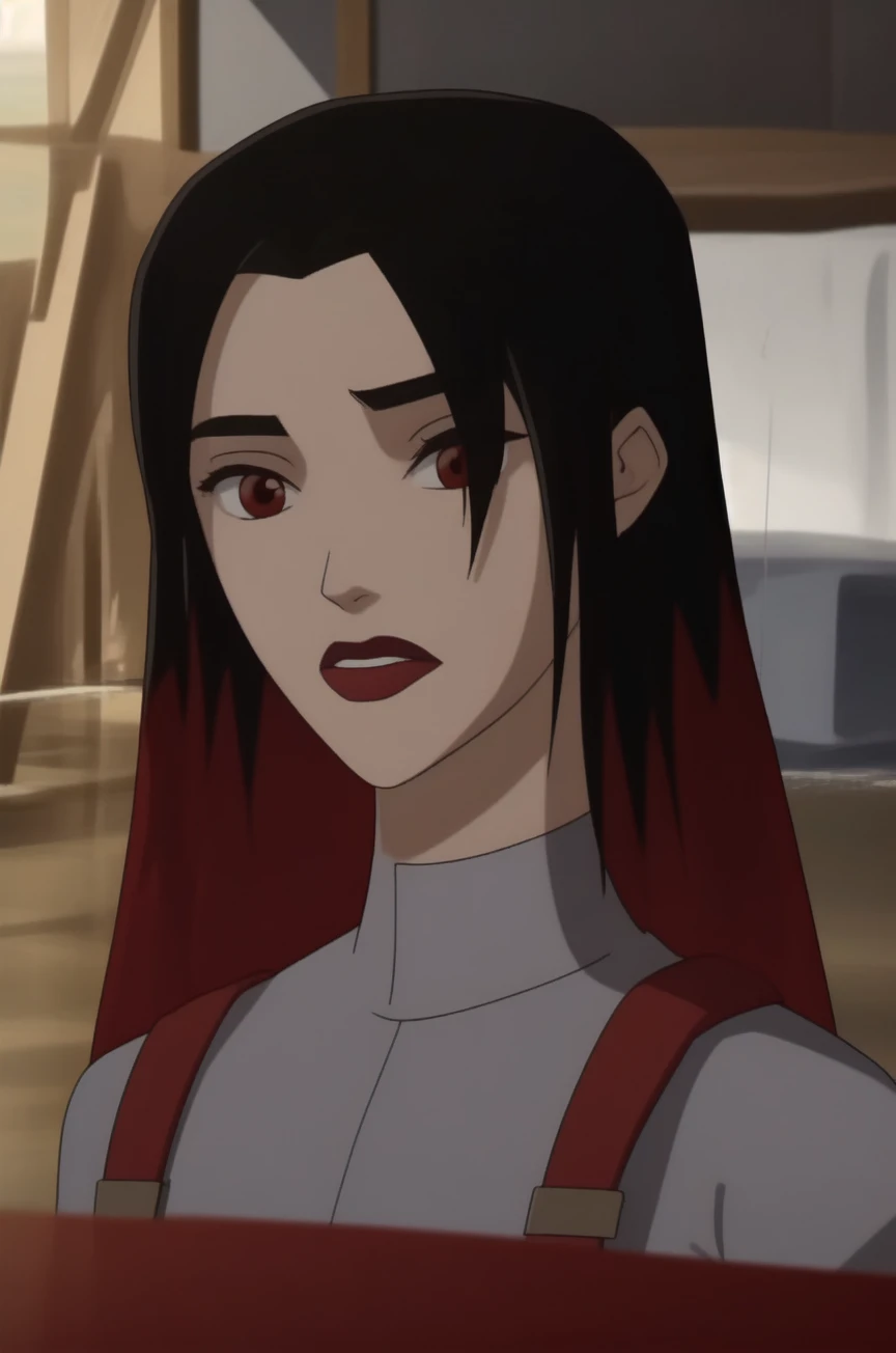 Circe, gray shirt, red jumpsuit, black hair, two-tone hair, red eyes, lipstick