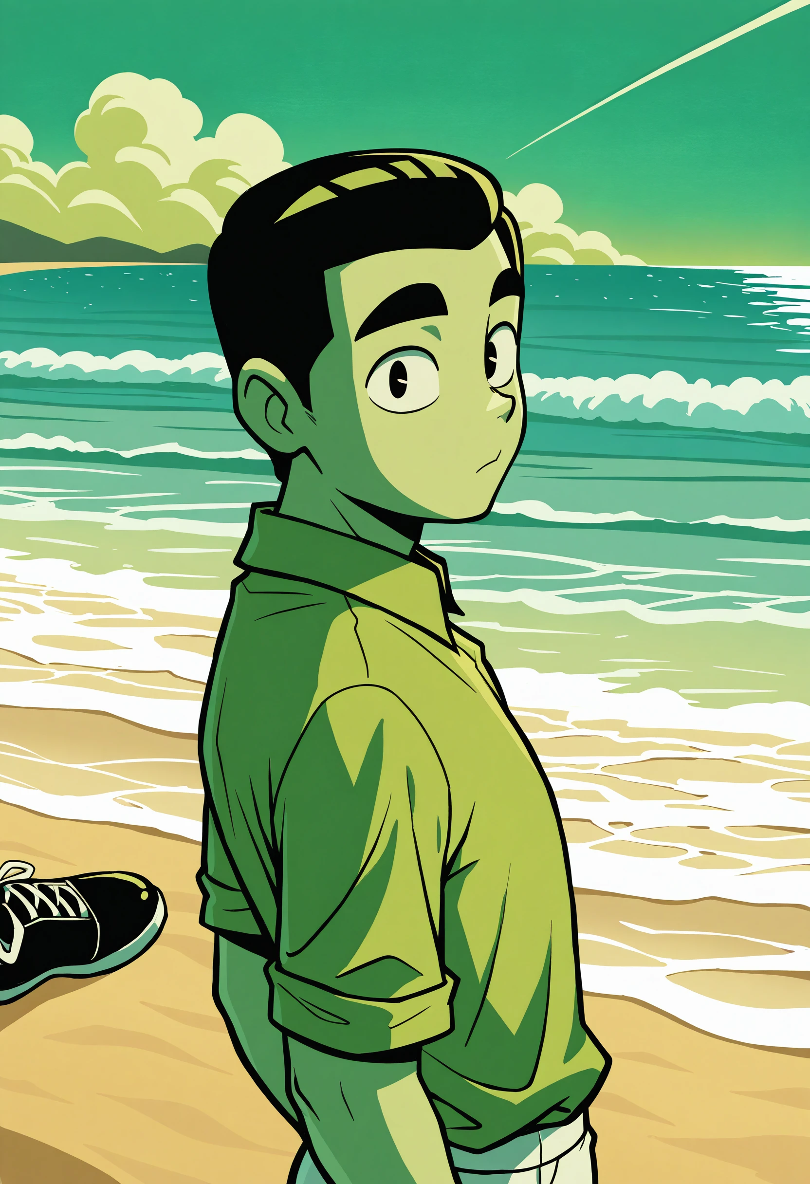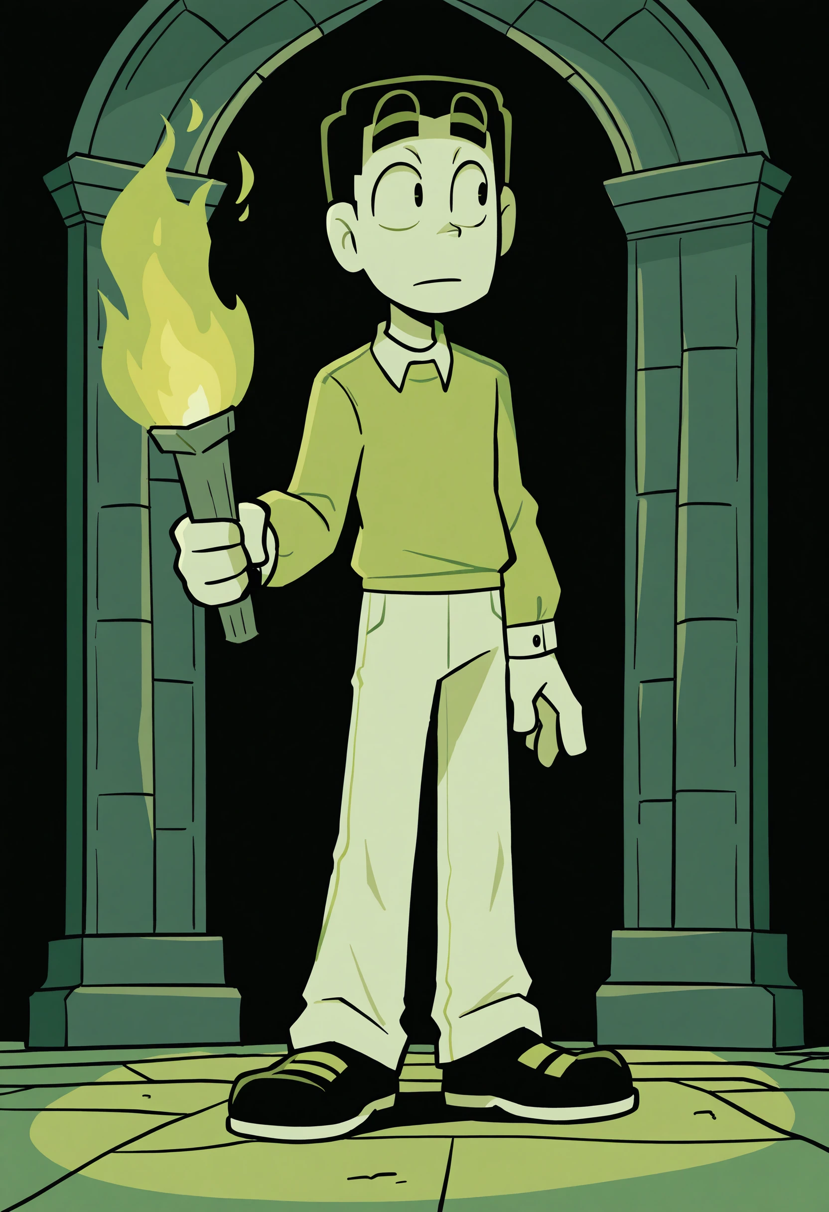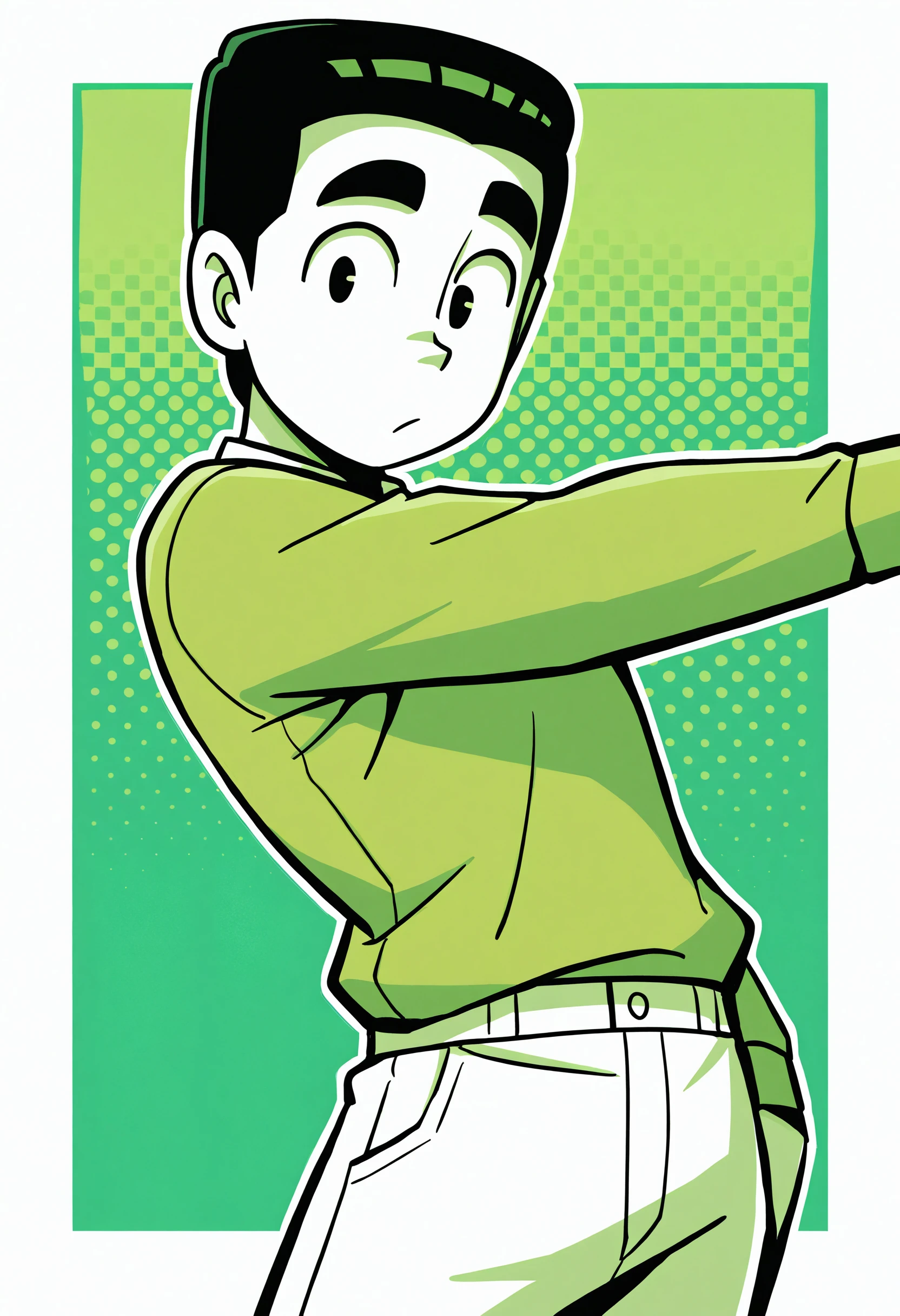 green shirt, long sleeves, white pants, black shoes