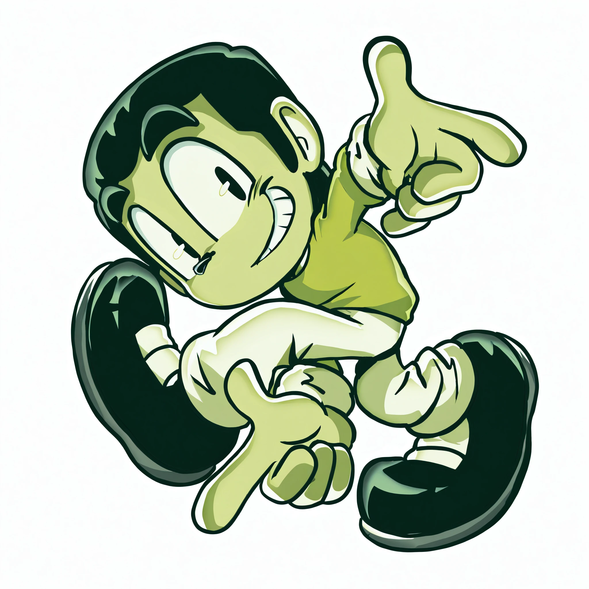 green shirt, long sleeves, white pants, black shoesOptional words: