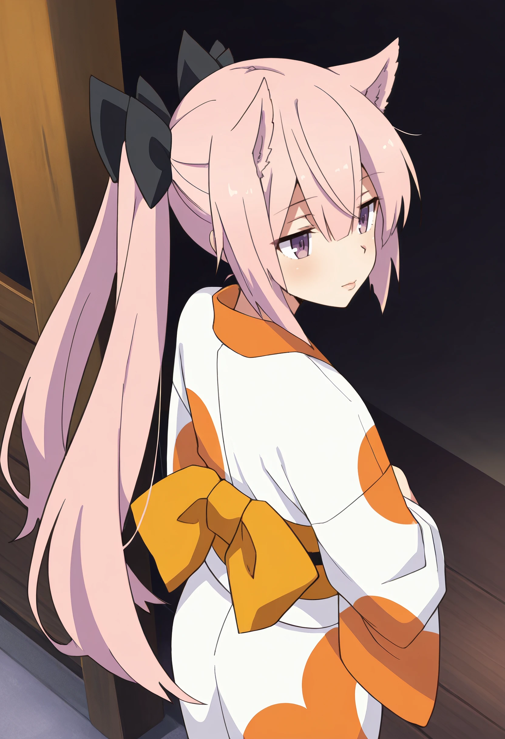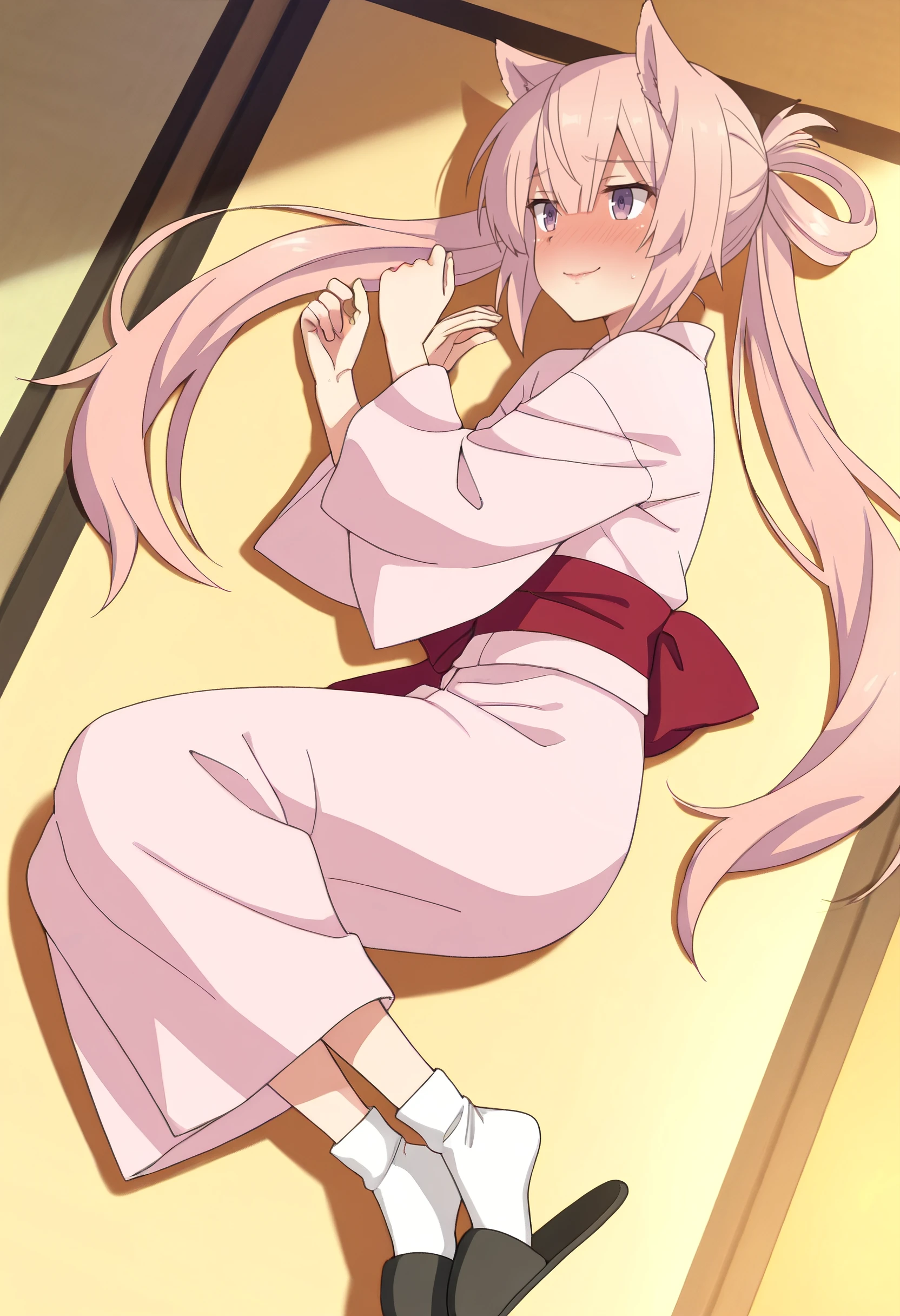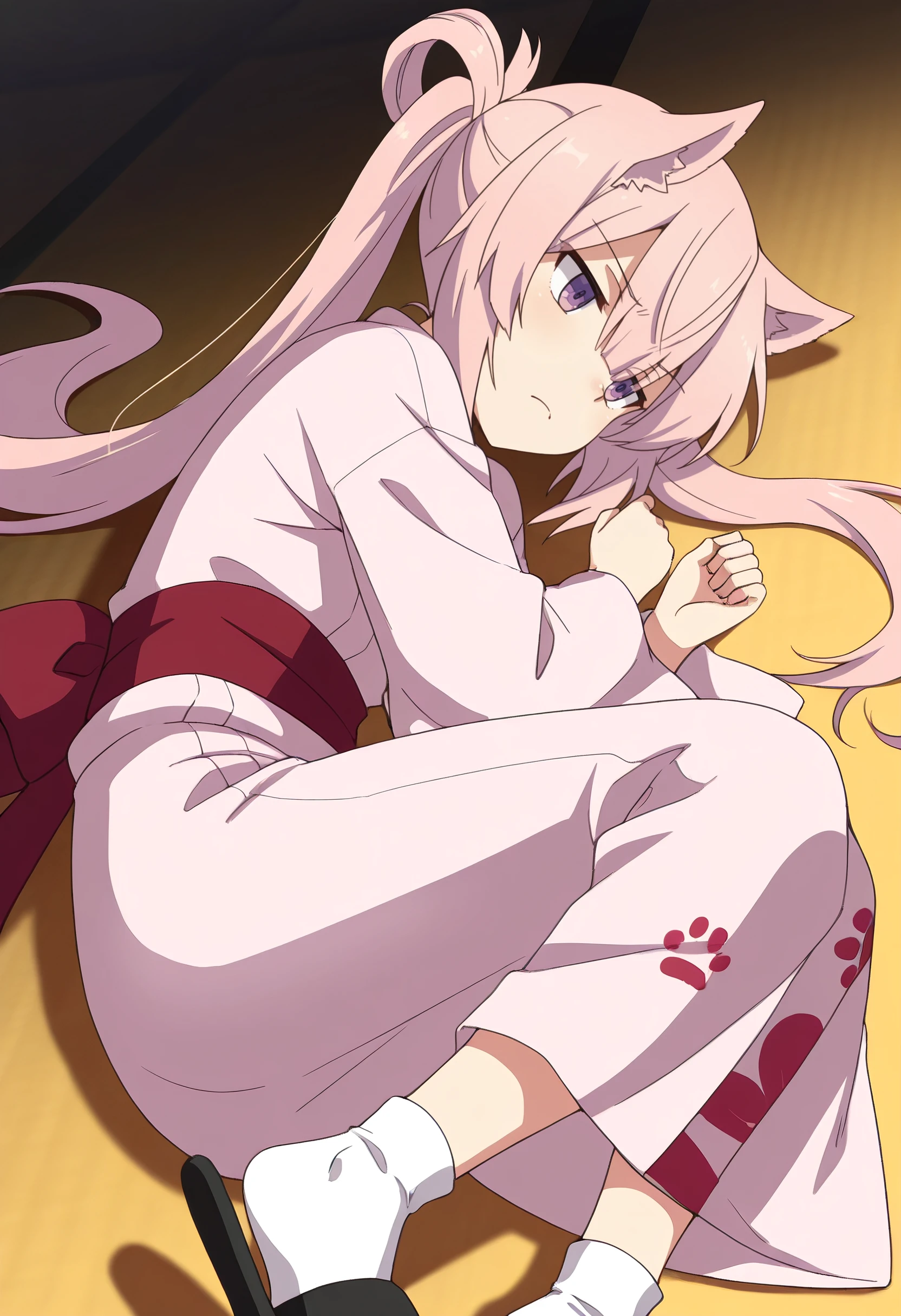 KaoruKimonoB, kimono, japanese clothes, yukata, sash, long sleeves, pink kimono, red sash, wide sleeves, hair rings, ponytail, black footwear, slippers, white socks, socks,