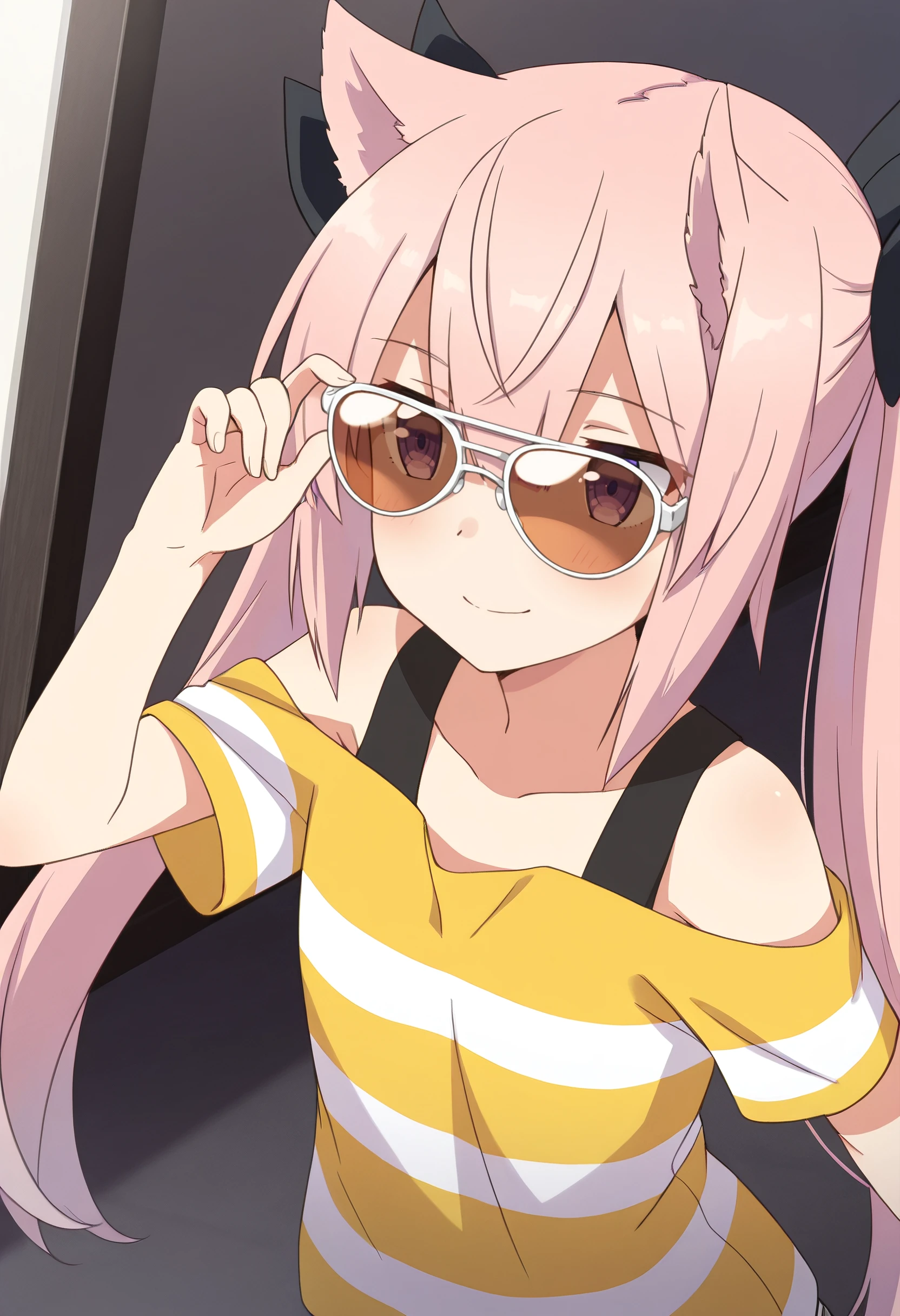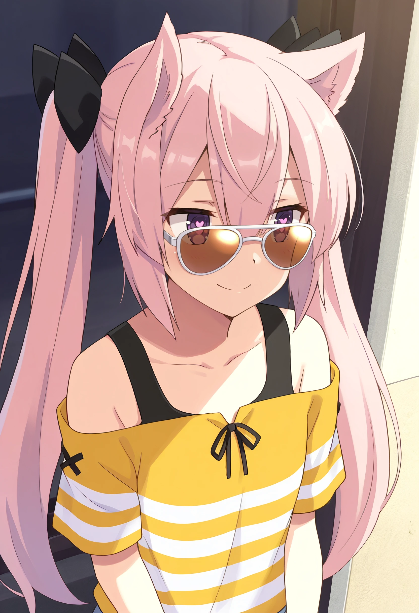 KaoruSummer, sunglasses, white-framed eyewear, black bow, tinted eyewear, hair bow, bow, shirt, yellow shirt, off shoulder, off-shoulder shirt, short sleeves, striped shirt, aviator sunglasses, hair ribbon, ribbon, orange-tinted eyewear, black ribbon, casual, t-shirt, black tank top, striped clothes,