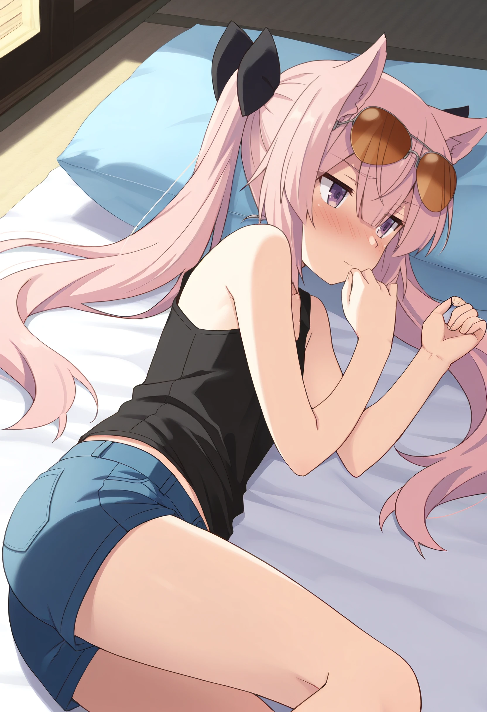 KaoruTanktop, sunglasses, tinted eyewear, shorts, black tank top, tank top, blue shorts, aviator sunglasses, hair ribbon, ribbon, round eyewear, hair bow, short shorts, orange-tinted eyewear, black bow, bow, black ribbon,