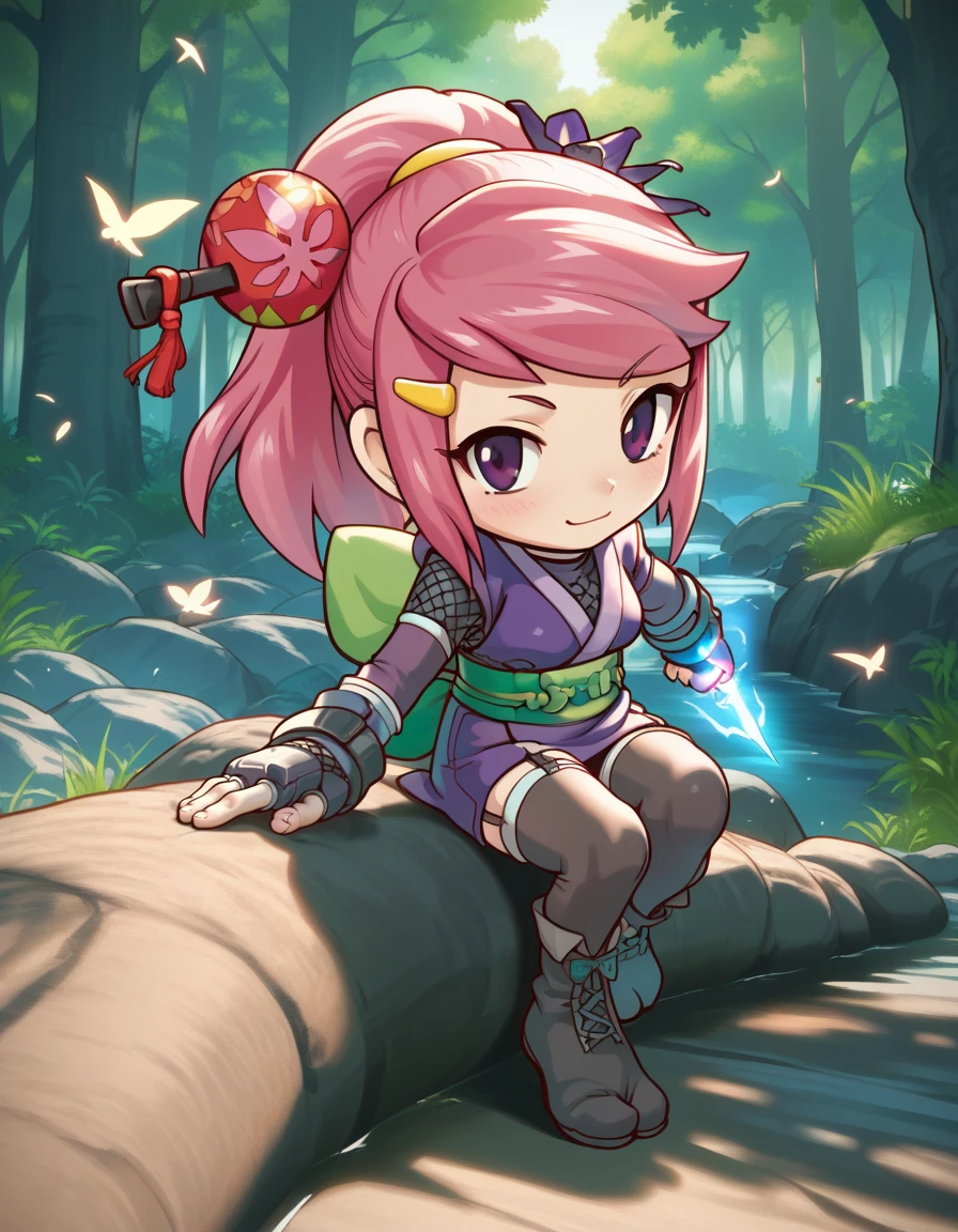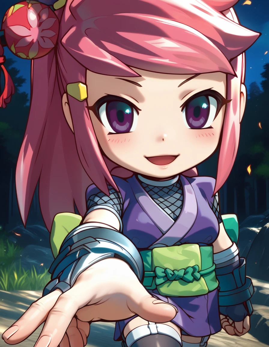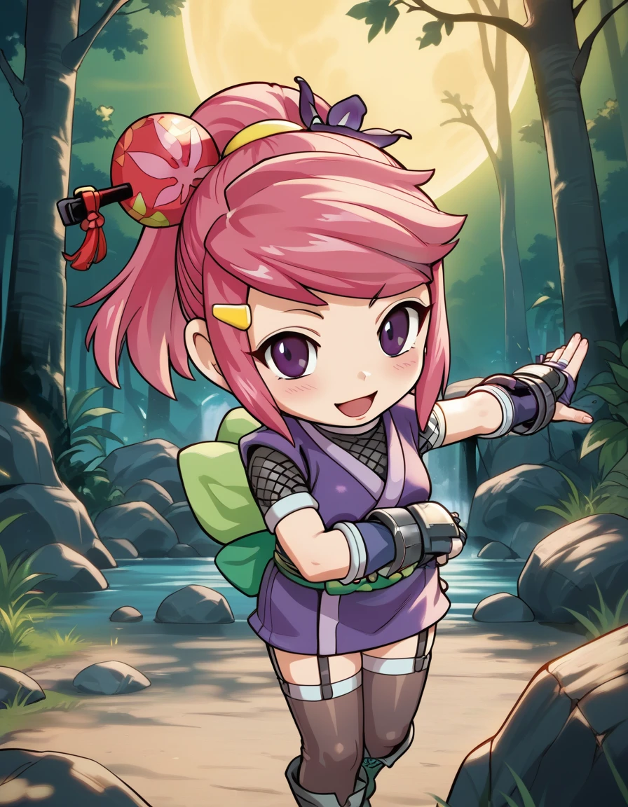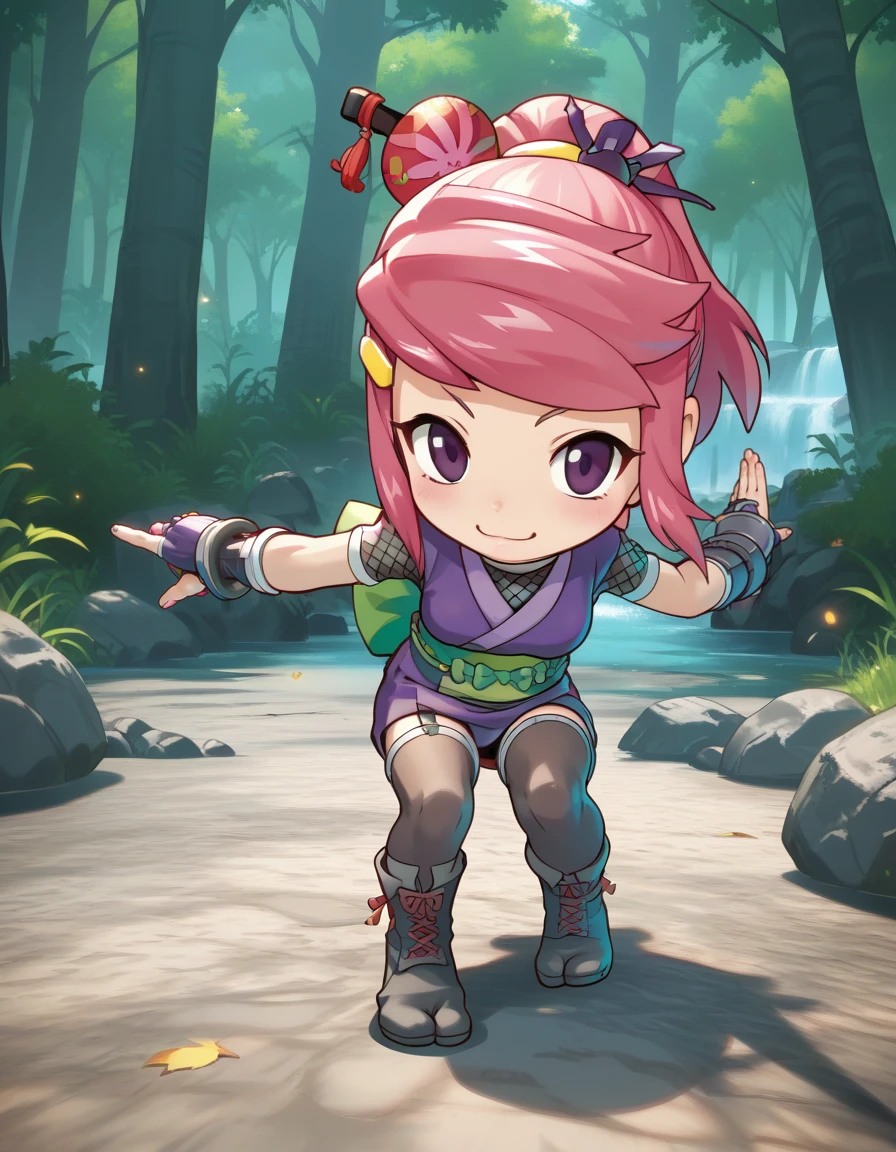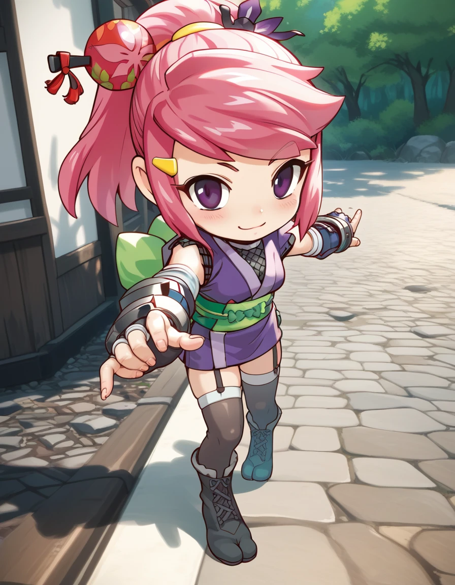 kaede (shinobi_damashii), pink hair, long hair, purple eyes, ponytail, hair ornament, hairclip, chibi,