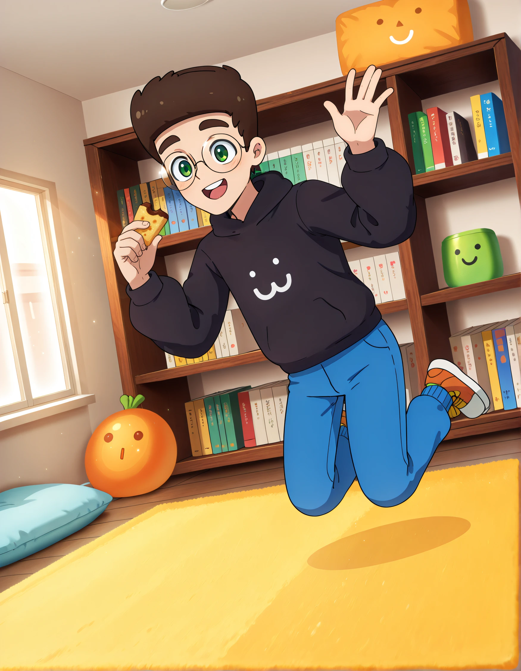 1boy, cr3at0r, adult, black hoodie, :3 on hoodie, blue pants, round eyewear, glasses, green eyes, tall,