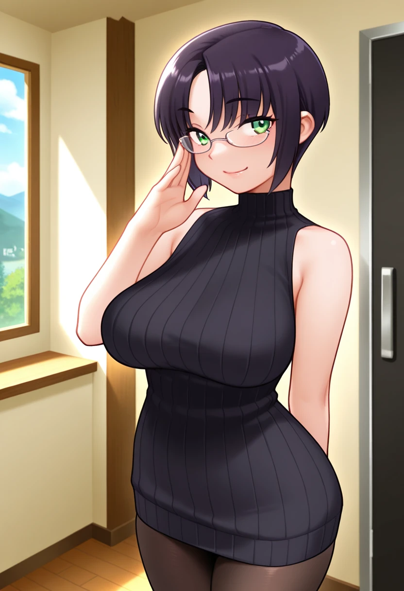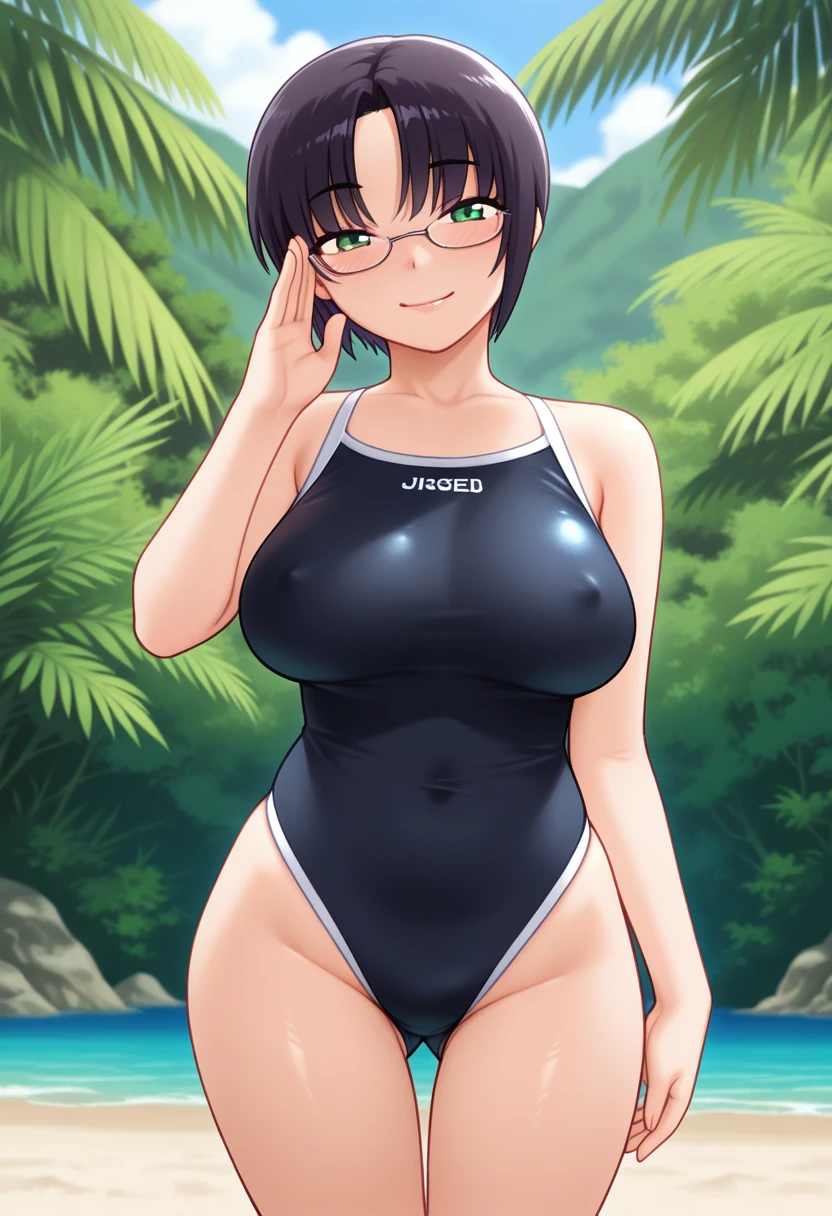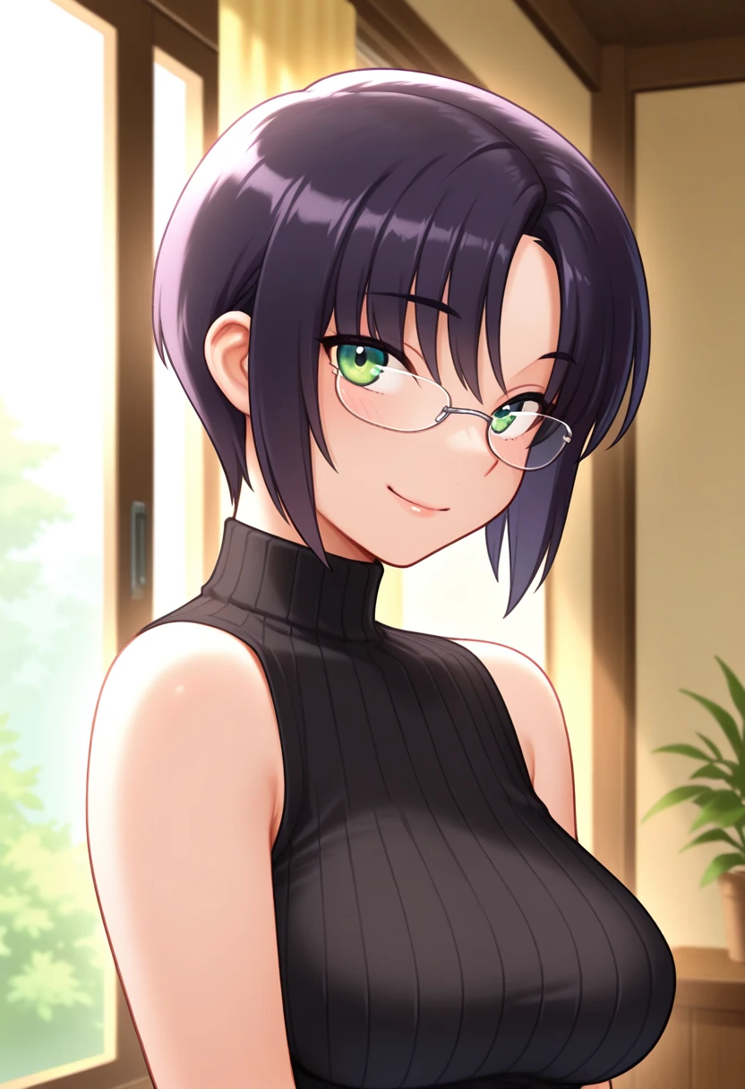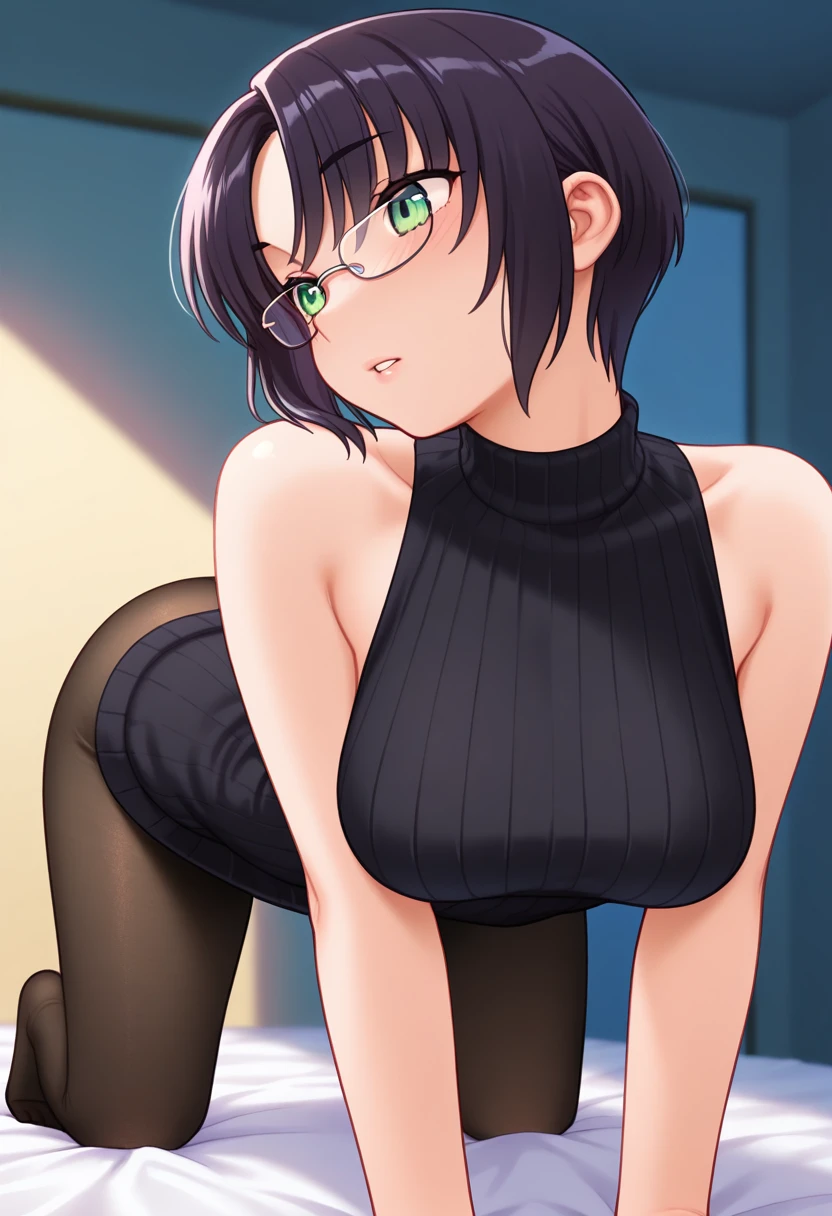 kaedeww, green eyes, black hair, short hair, parted bangs, glasses, large breasts,