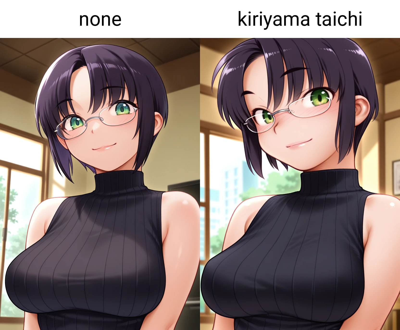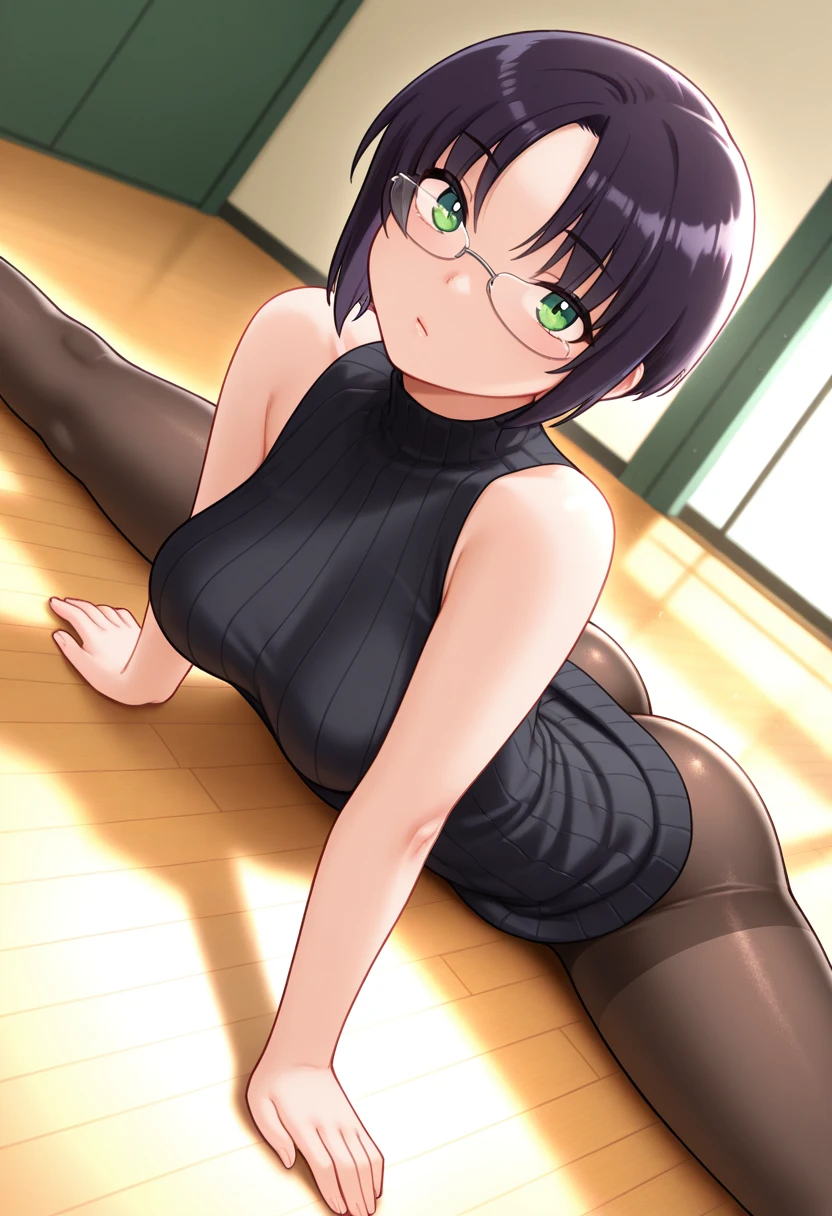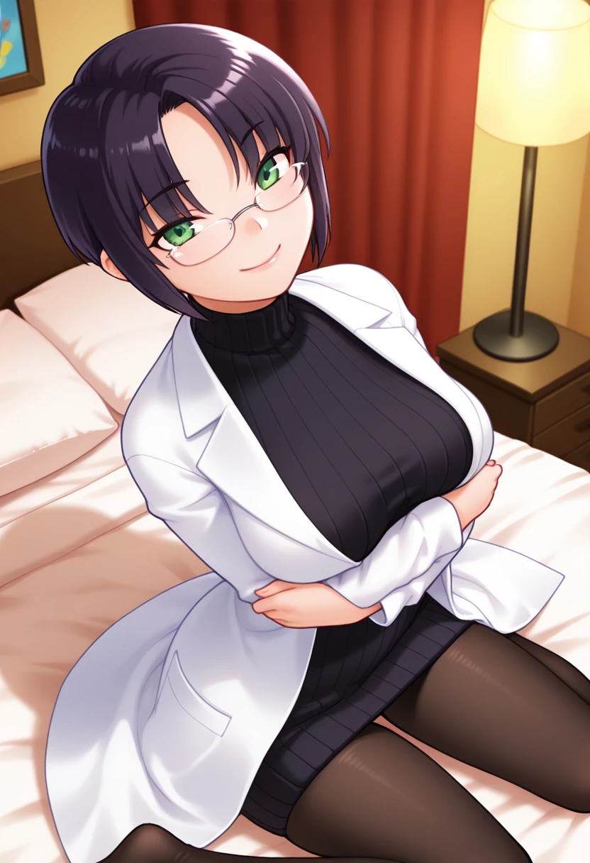 kaedeww, green eyes, black hair, short hair, parted bangs, glasses, large breasts,