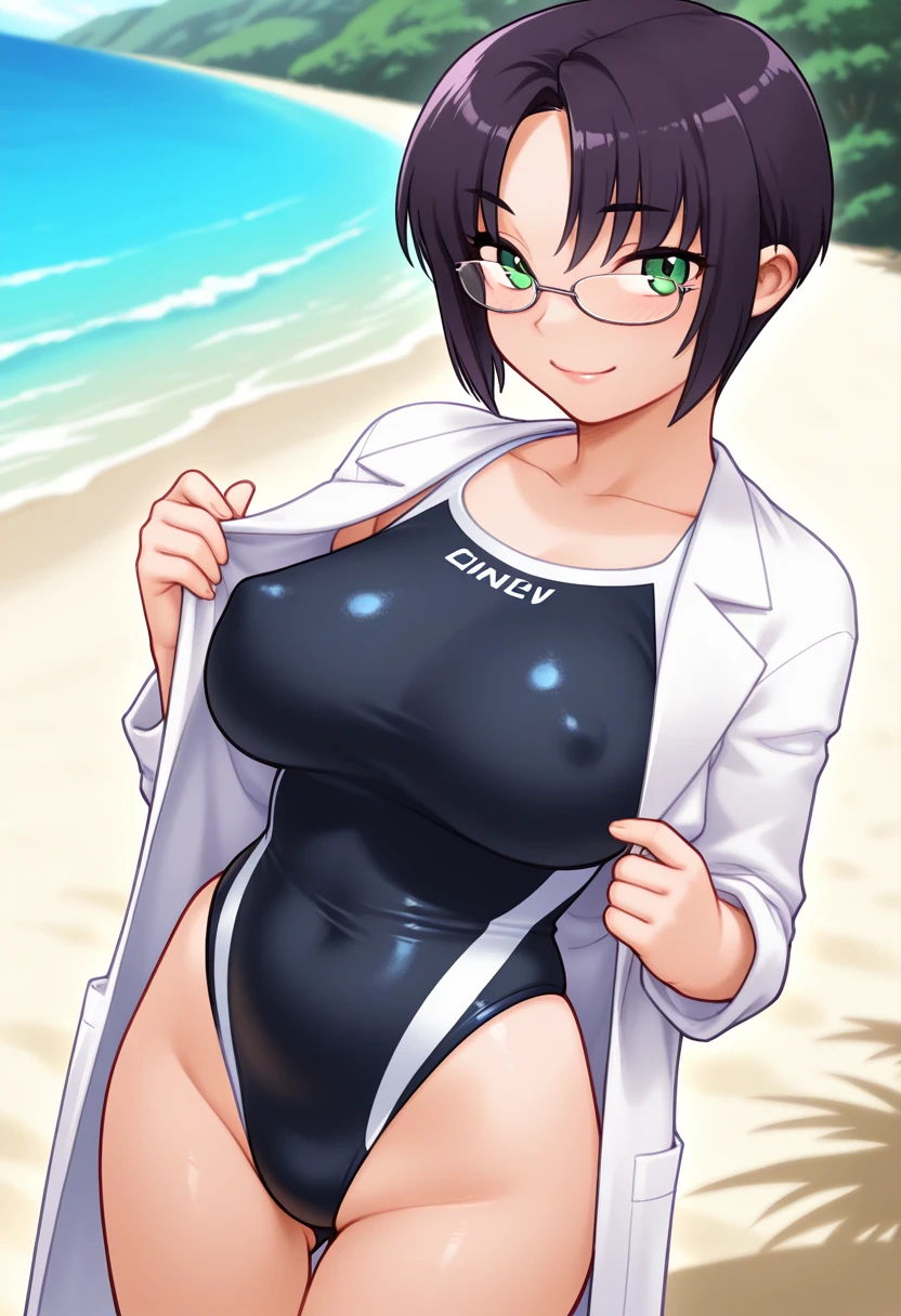 lab coat, swimsuit under clothes, black one-piece swimsuit, competition swimsuit, covered nipples,