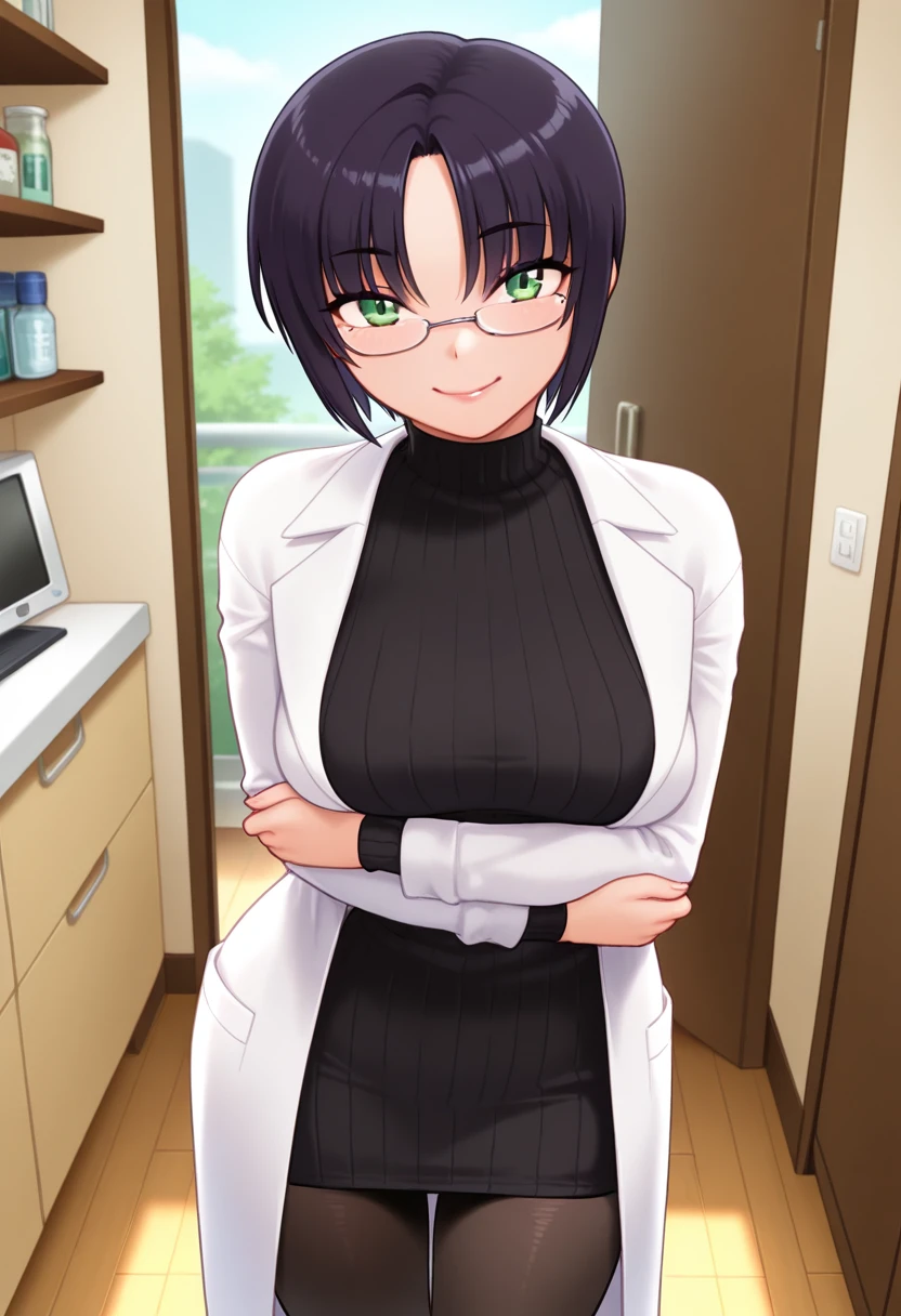 lab coat, black sweater dress, ribbed sweater, turtleneck sweater, black pantyhose, pumps,