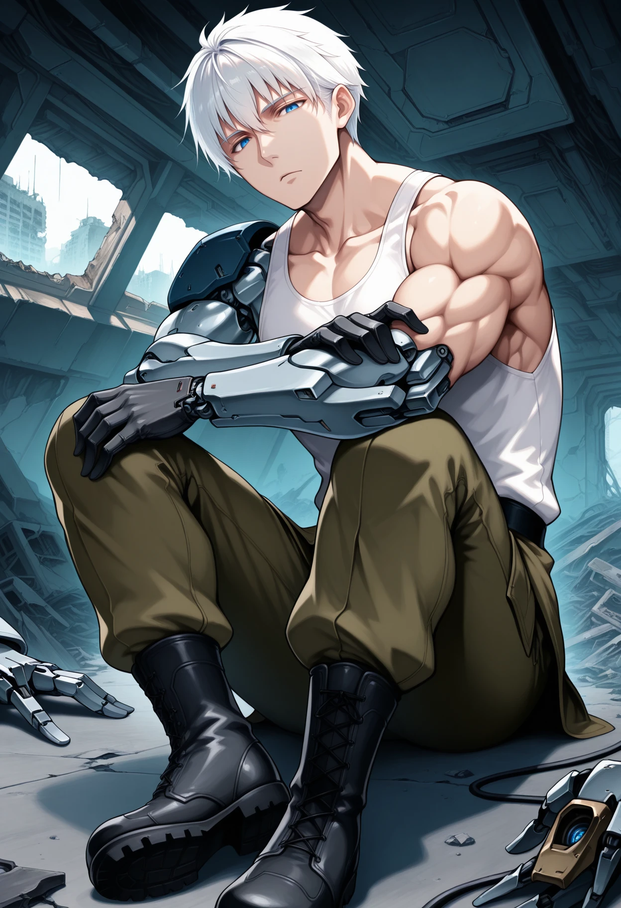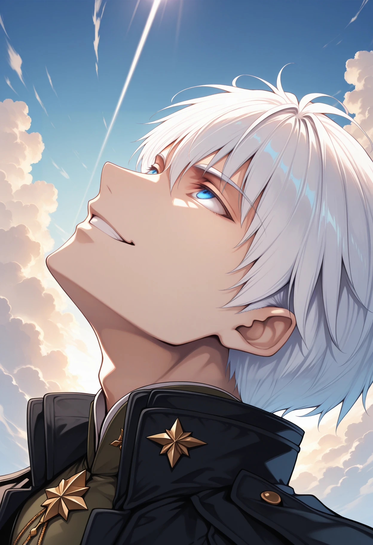 johan, blue eyes, white hair, short hair, necklace, black coat, military uniform, brown pants, belt, black gloves