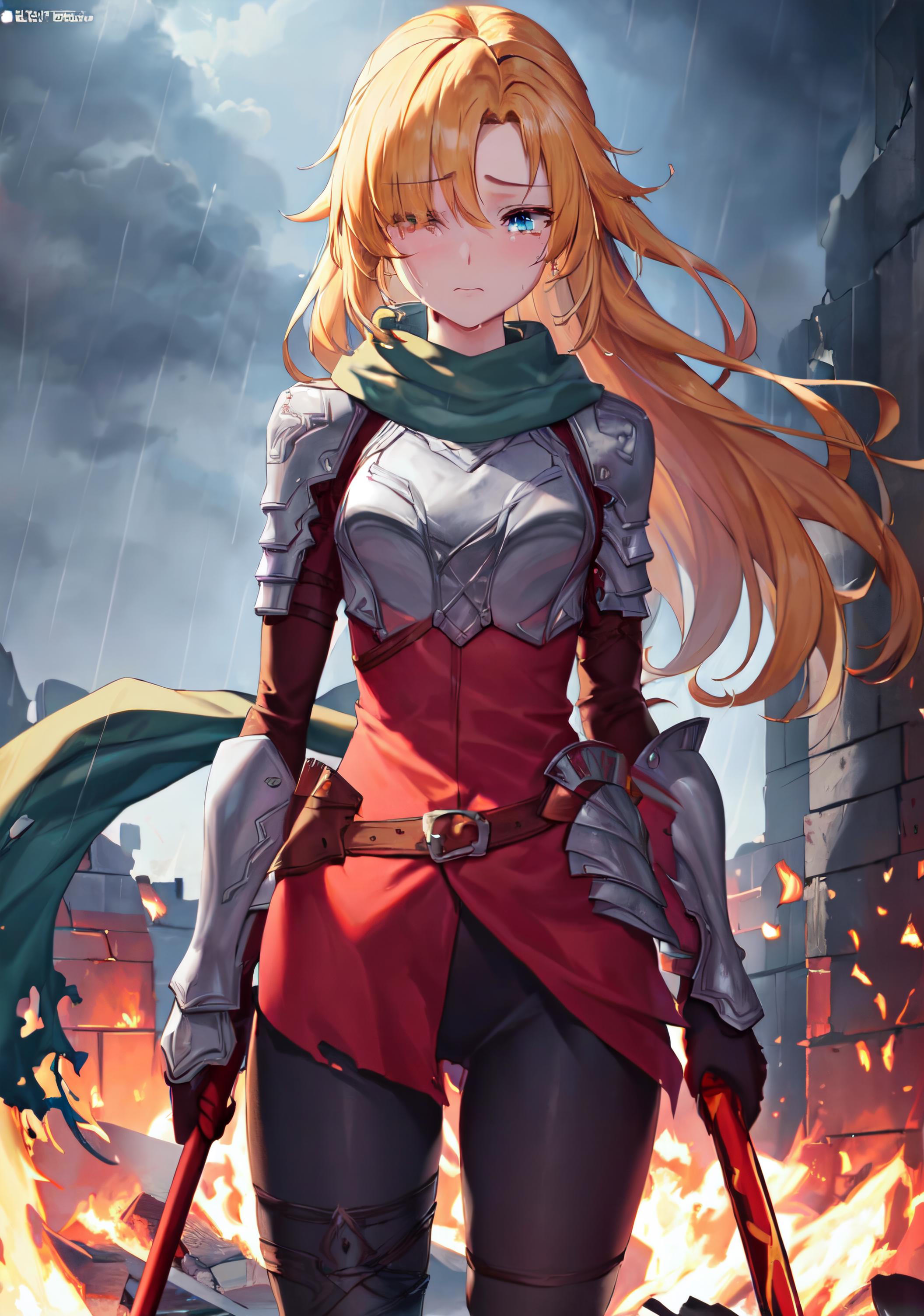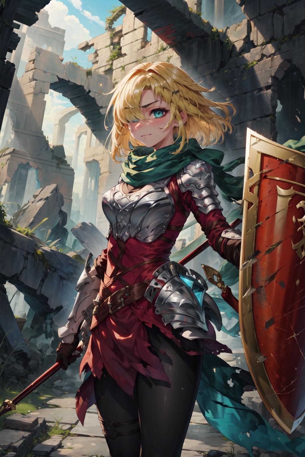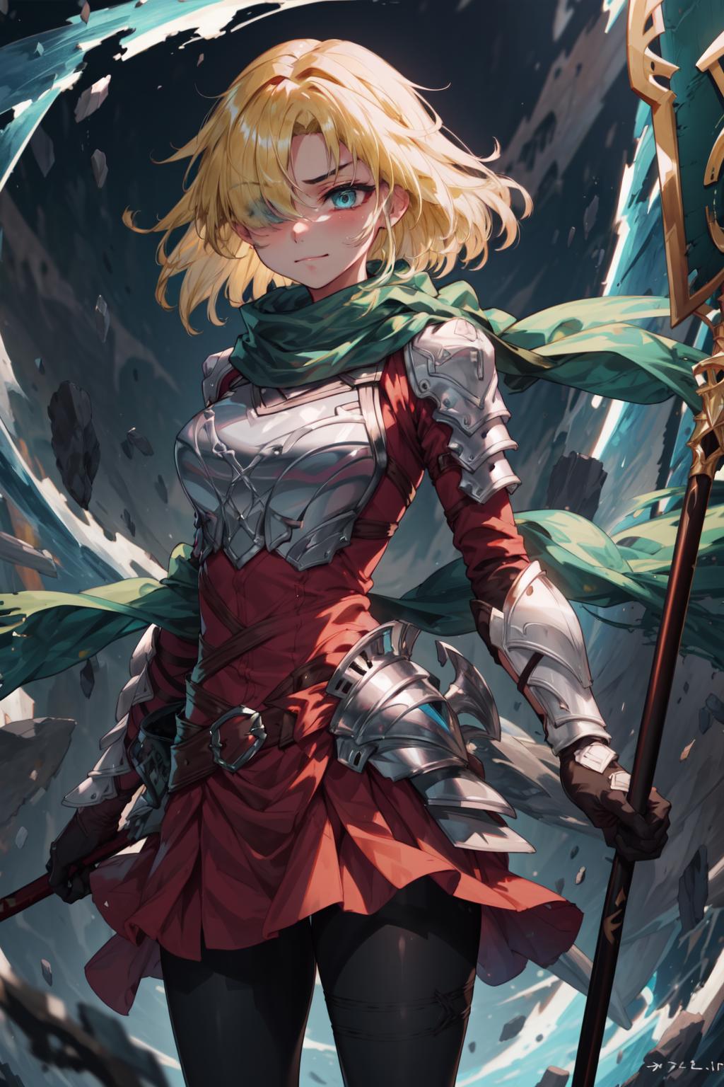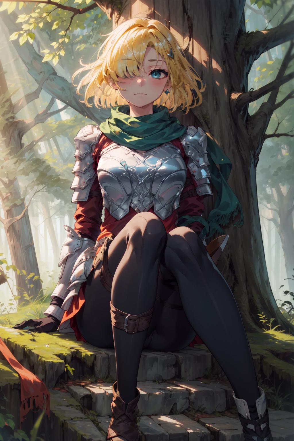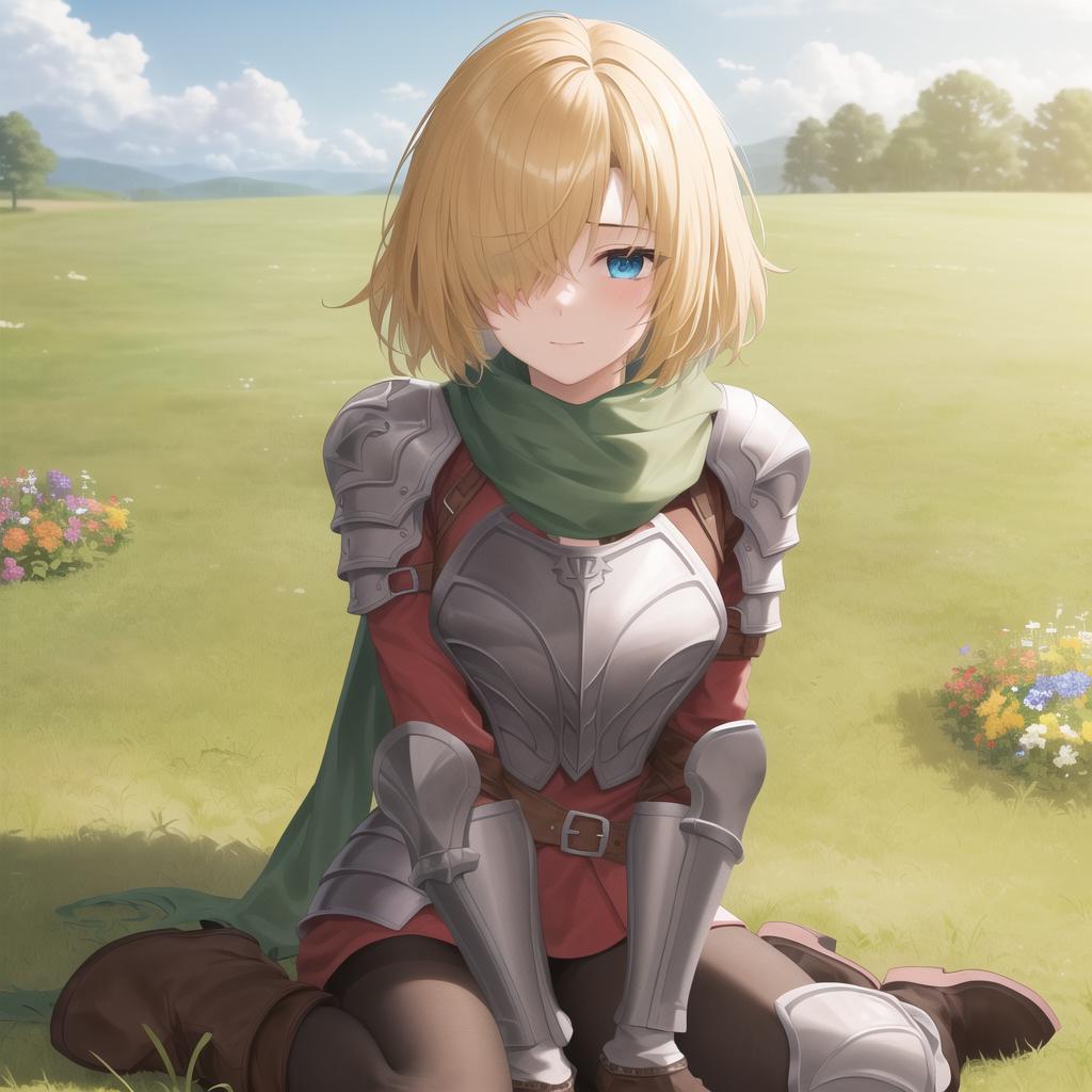 for better result you can add :blonde hair, armor, hair band, breastplate,shoulder armor, light smile,bangs , ,boots ,, green scarf ,armored boots,, hair over one eye ,blue eyes ,gloves , ,pantyhose