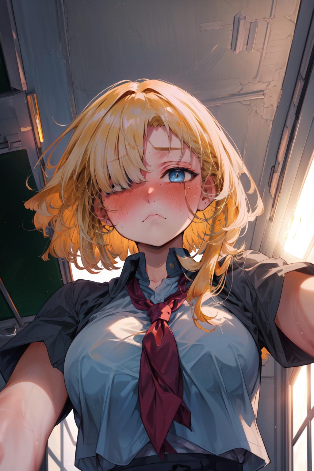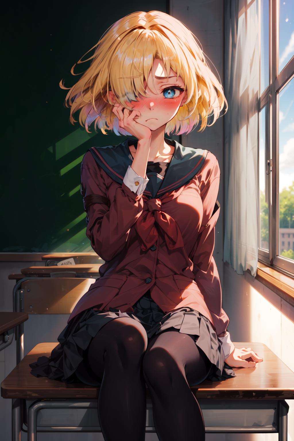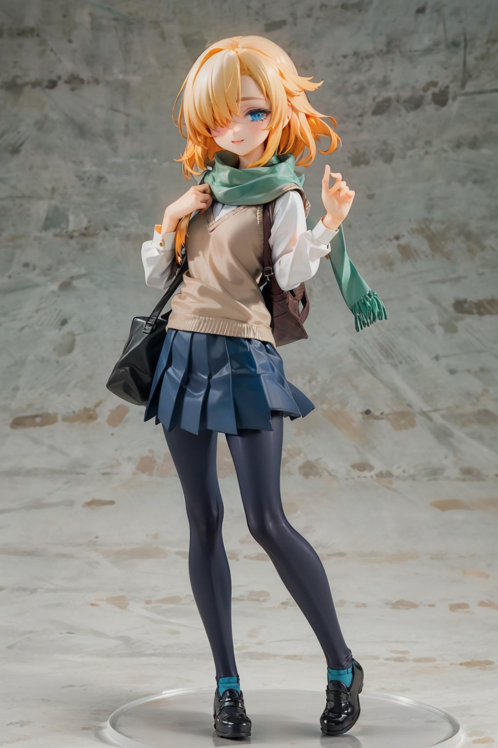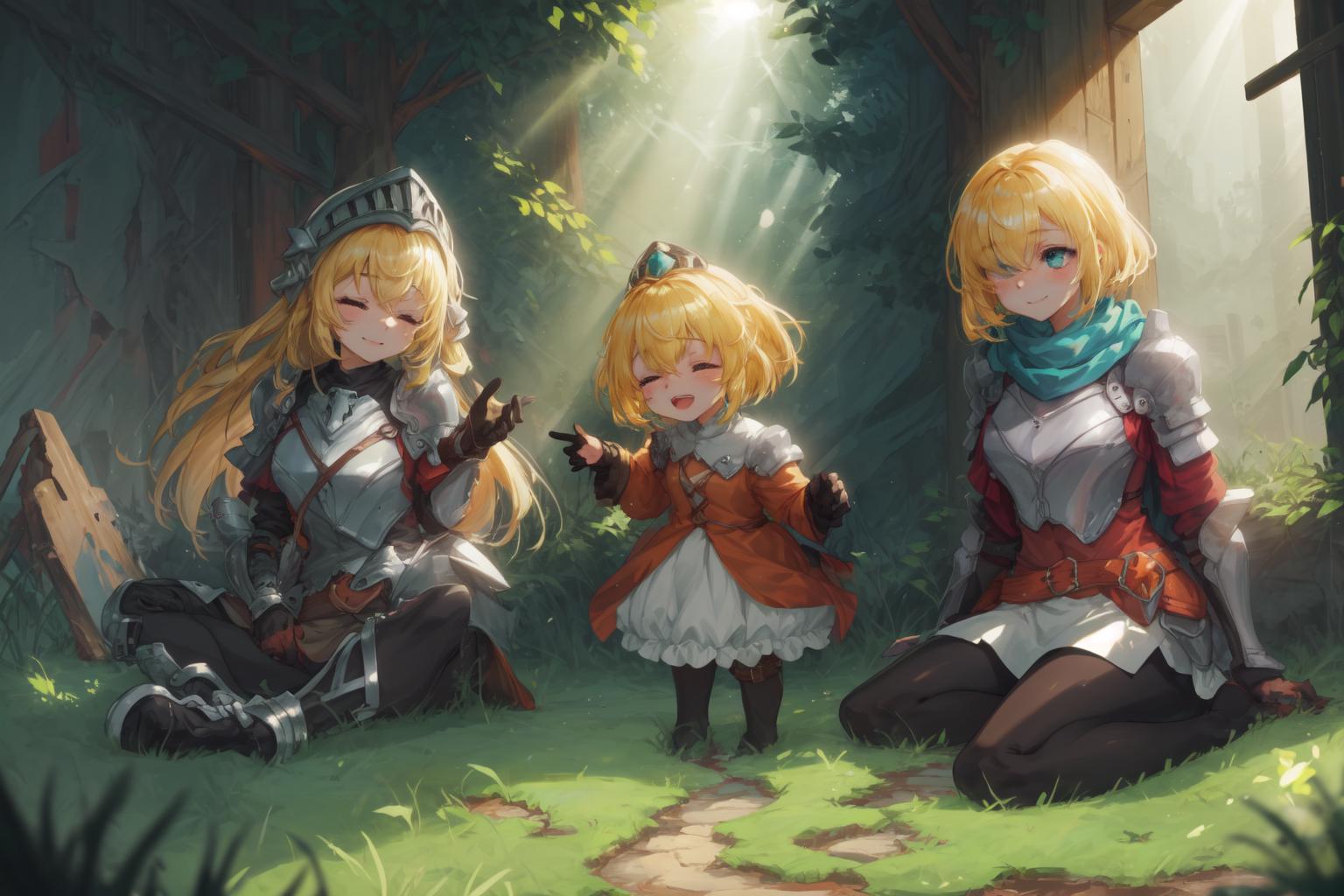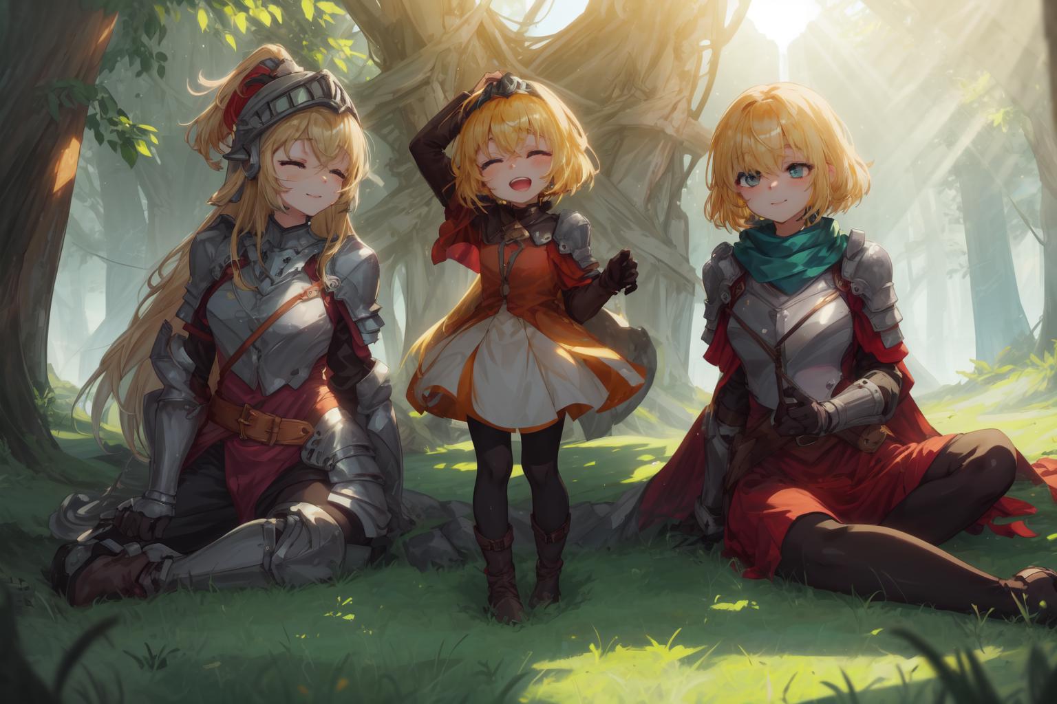 for better result you can add :blonde hair, armor, hair band, breastplate,shoulder armor, light smile,bangs , ,boots ,, green scarf ,armored boots,, hair over one eye ,blue eyes ,gloves , ,pantyhose