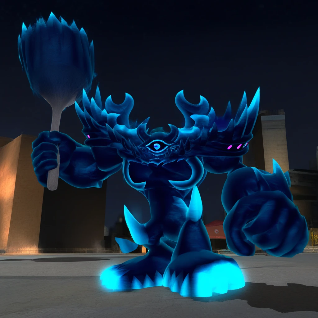 Tags (Regular Titan): no humans, shoulder spikes, solo, standing, glowing, pink blue eye, spikes, wooden club, large monster, full body, titan (dark blue) , big forearms , dark blue neon skin, pink spots on forearm, dark aura, knee spikes, pink spots on shoulders
