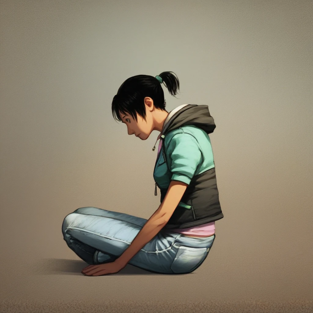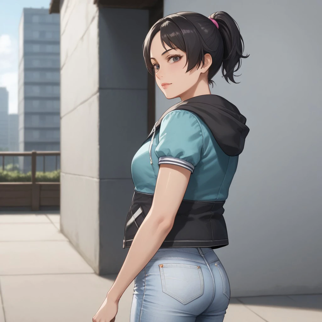 bhadra, black hair, short hair, ponytail, jacket, jeans