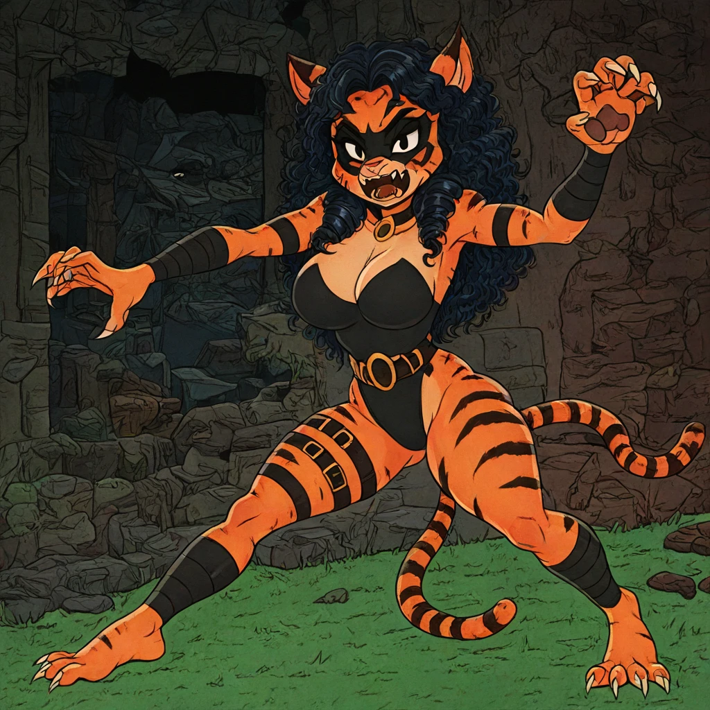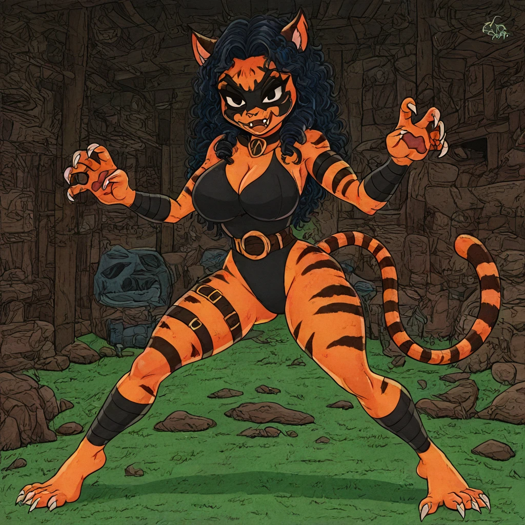 FemmeFelineMS, 1girl, solo, cat girl, furry female, anthro, tigress, black hair, long hair, curly hair, bangs, black mask, black eyes, animal ears, snout, fangs, large breast, thick thighs, oranпe striped fur, tigers tail, black leotard, barefoot, belt with ring, paws, claws, thigh strap, black armband,