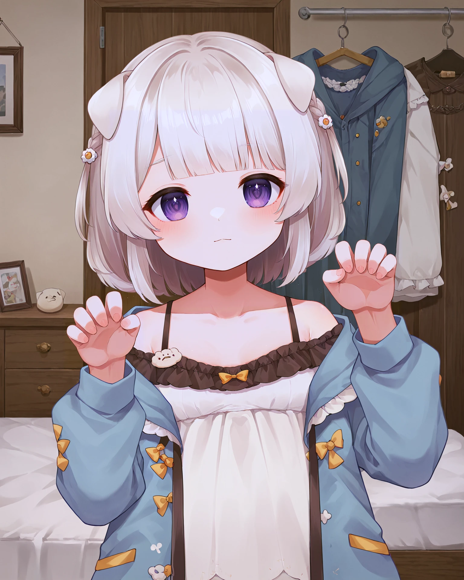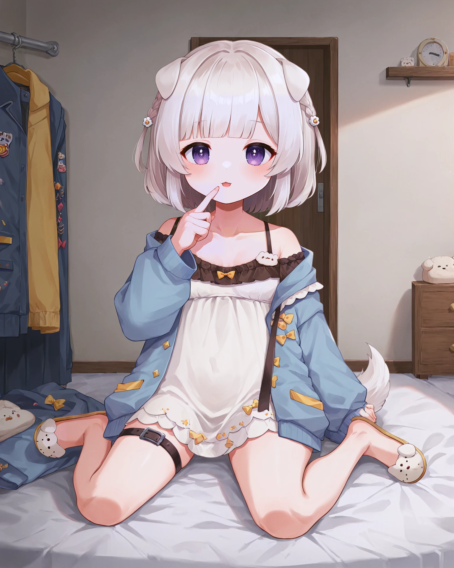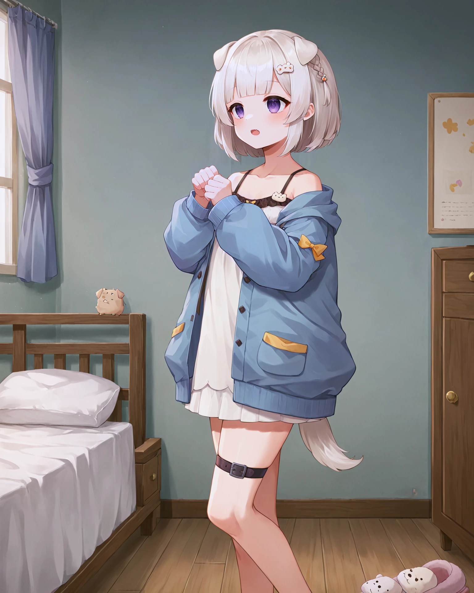 white hair, short hair, dress, white dress, nightgown, off shoulder, bow, collarbone, bare legs, thigh strap, slippers, jacket, long sleeves, sleeves past wrists, open clothes, open jacket, blue jacket,