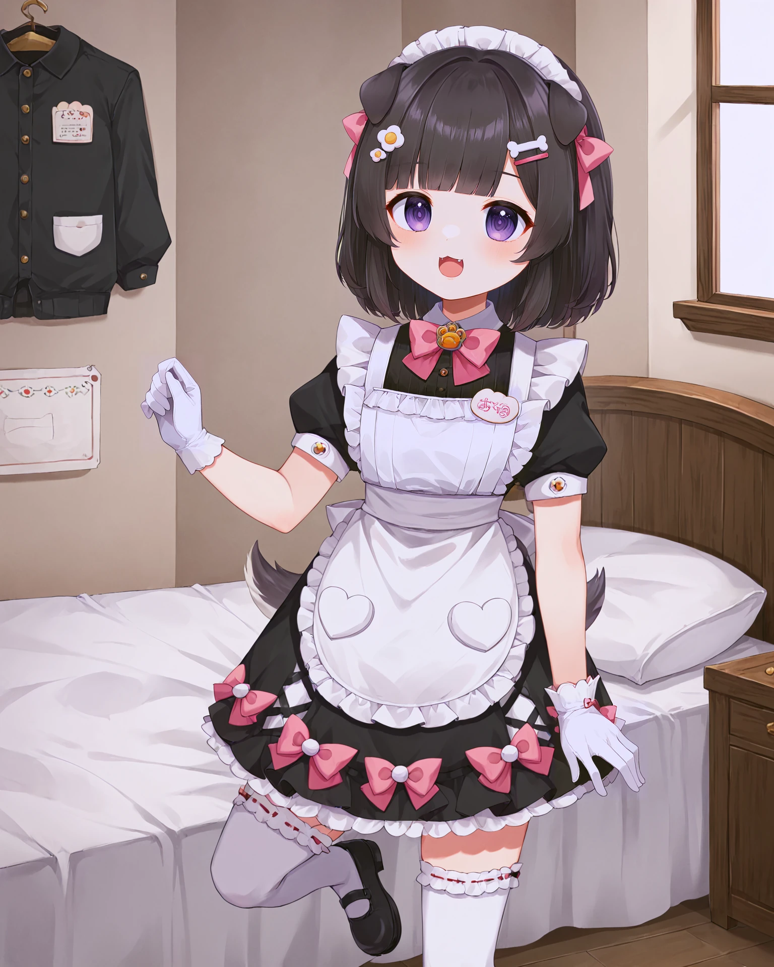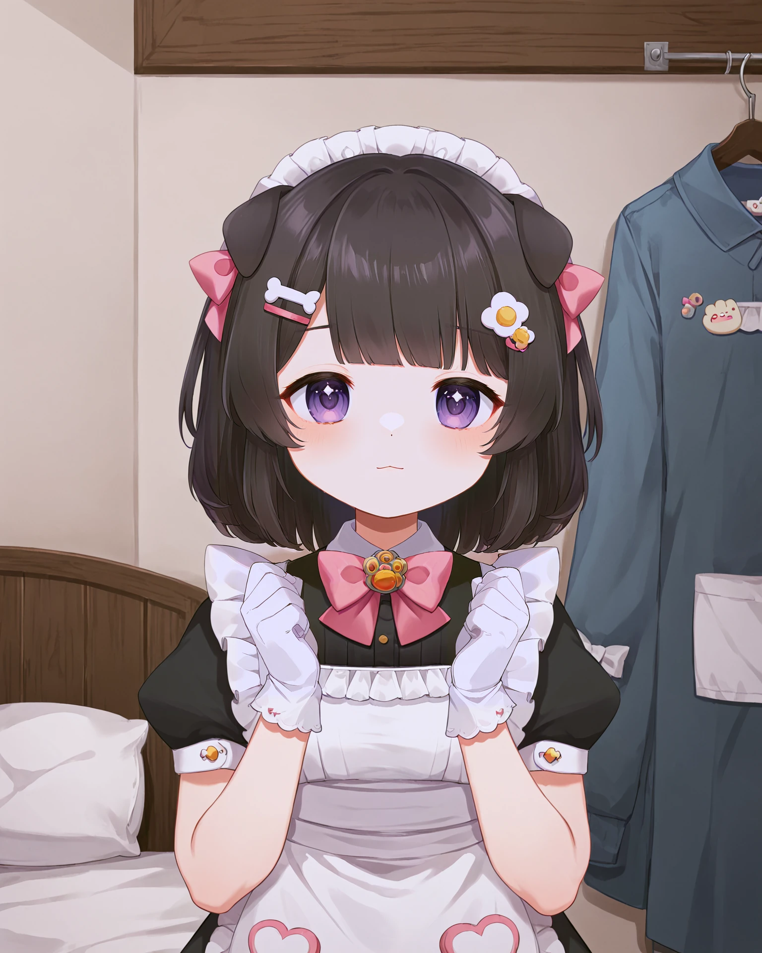short hair, black hair, hair bow, hairclip, maid headdress, bowtie, pink bowtie, pink bow, dress, frilled dress, black dress, frills, apron, white apron, frilled apron, bow, short sleeves, puffy short sleeves, gloves, white gloves, frilled gloves, thighhighs, white thighhighs, frilled thighhighs, bow legwear, shoes, black footwear,