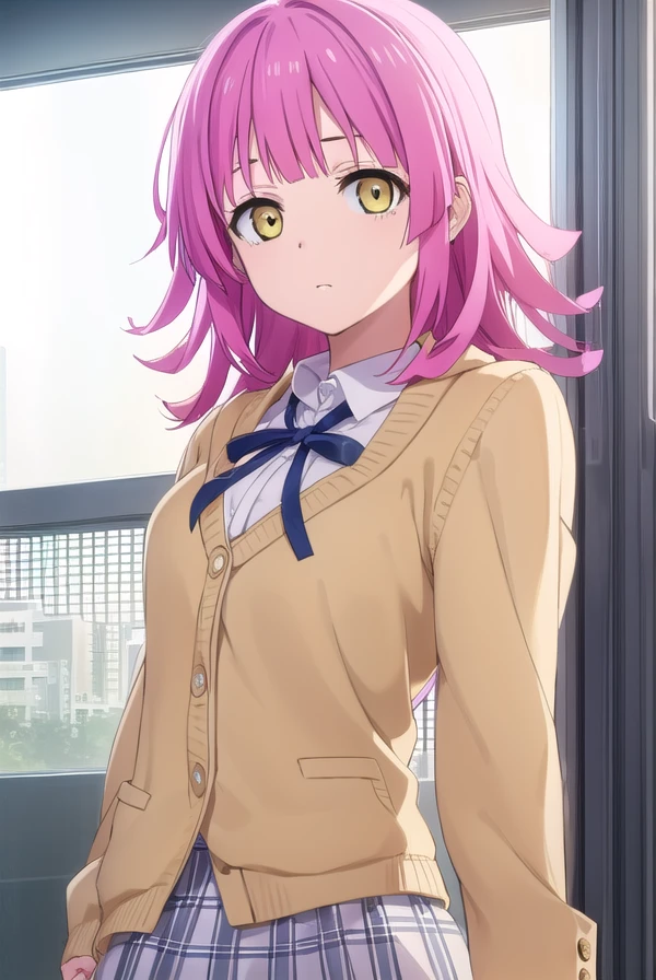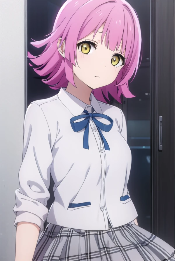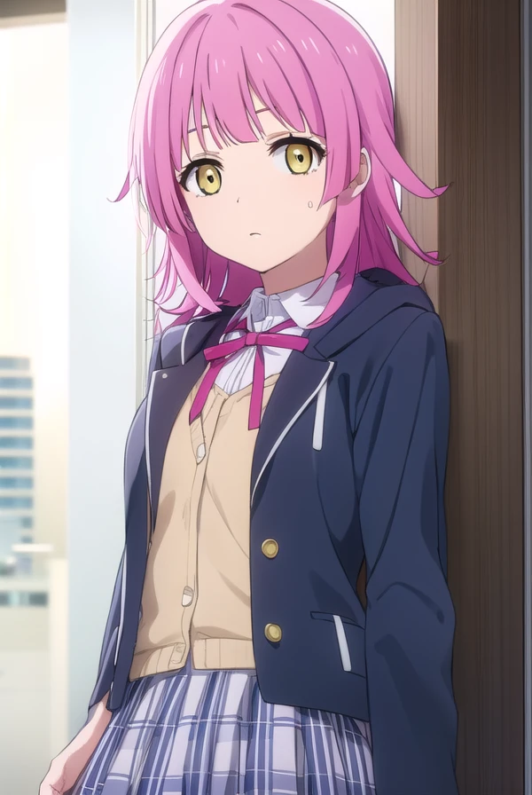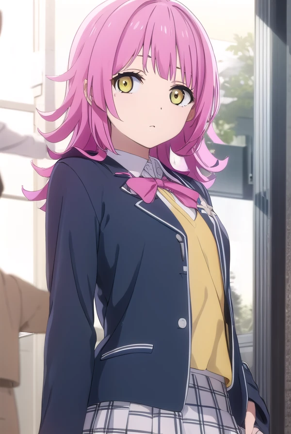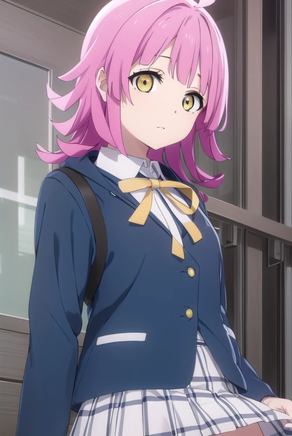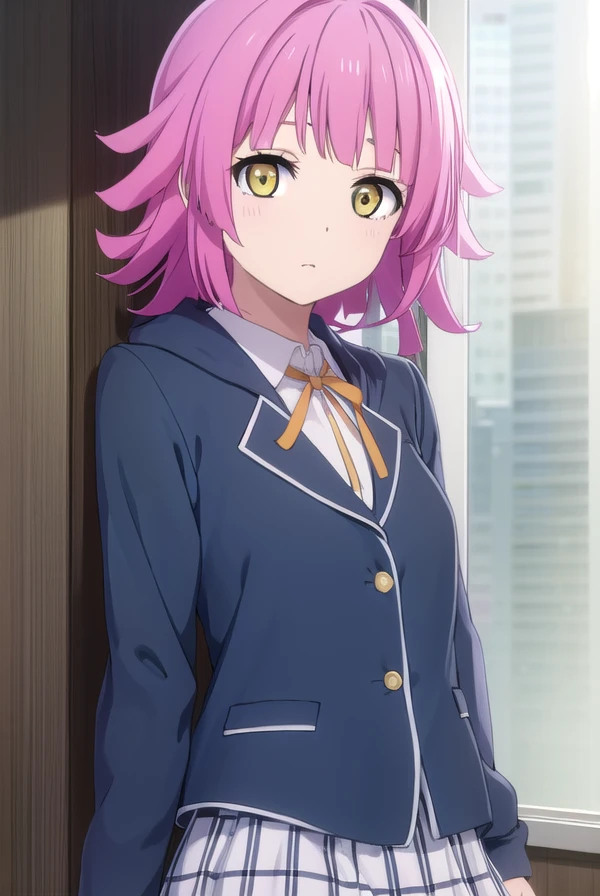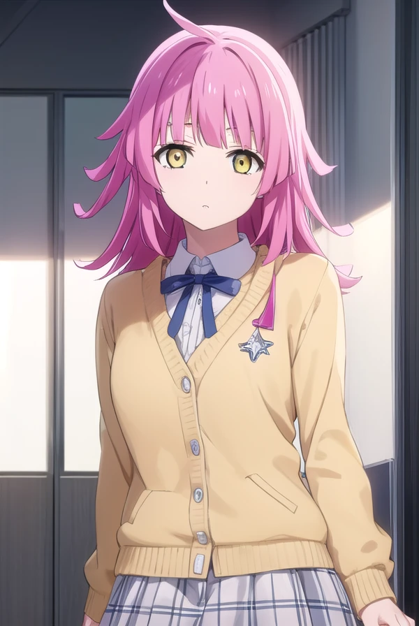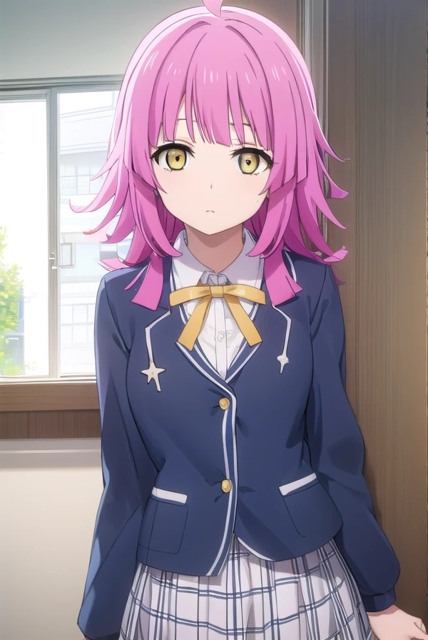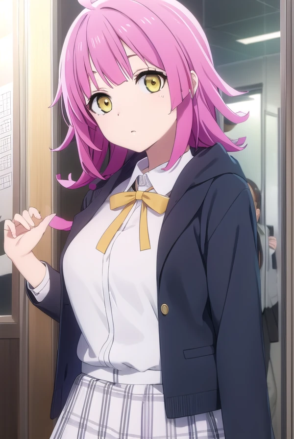 rina tennouji, bangs, (yellow eyes:1.3), pink hair, ahoge, blunt bangs, medium hair, blunt ends,