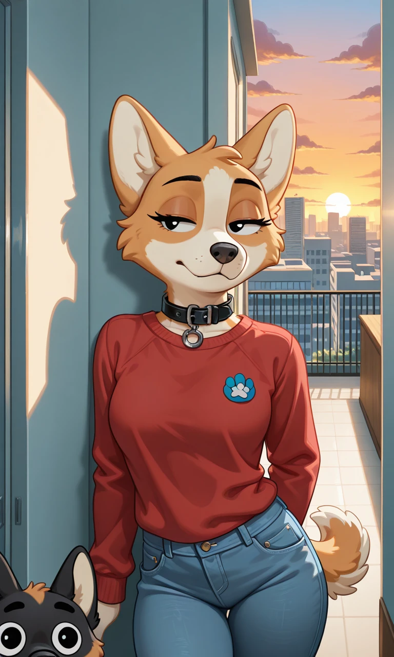 prompts: Elsa_(HB) creature_((\animal\)), Dog, Welsh Corgi, orange-white fur, two-tone fur, fluffy tail, black eyes
