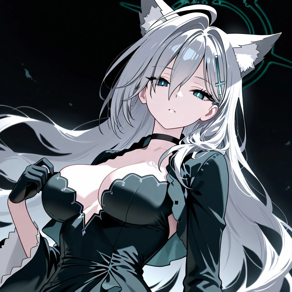 blue eyes,grey hair,hairclip,long hair,animal ears,halo,black choker,medium breasts