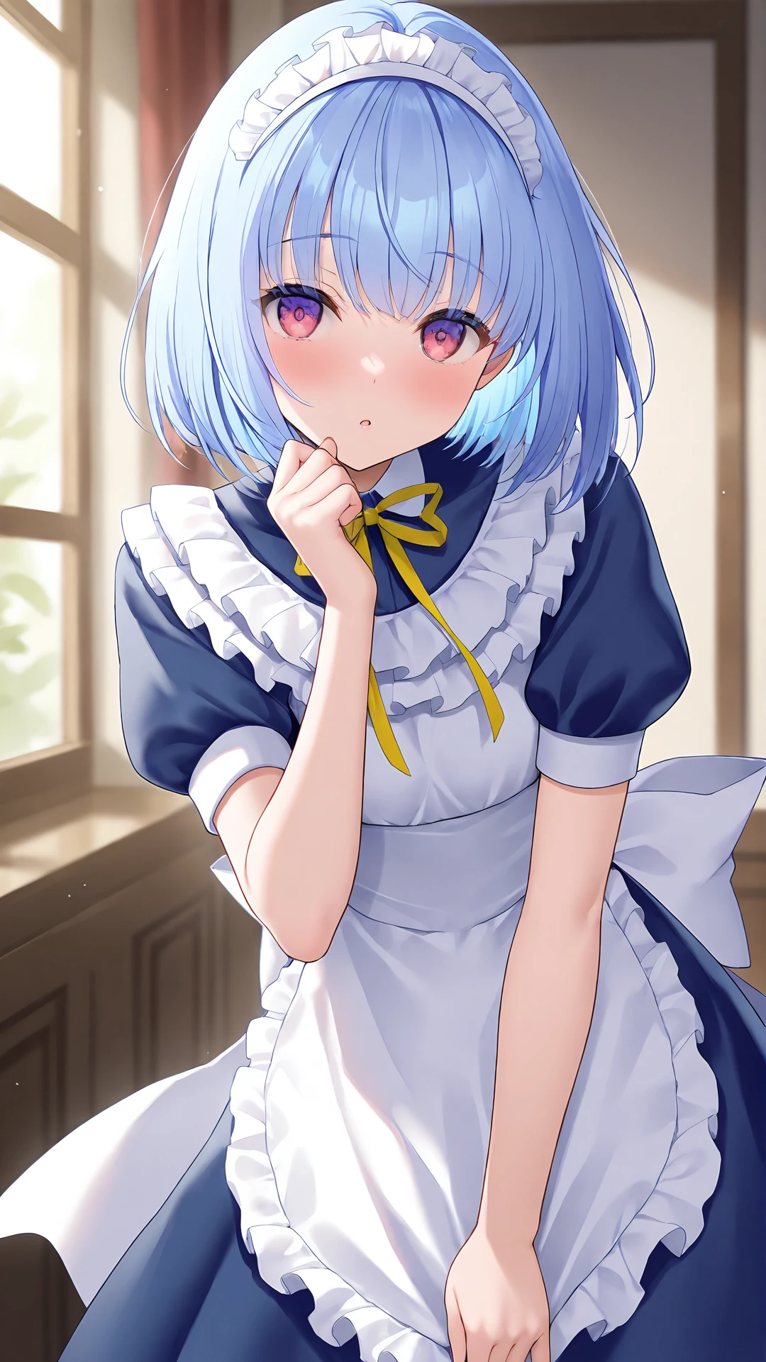 Mizuki Hitomi,1girl,solo,maid,blue hair,short hair,red eyes,purple eyes,dress,blue dress,apron,maid headdress,frills,ribbon,bow,short sleeves,puffy sleeves,puffy short sleeves,