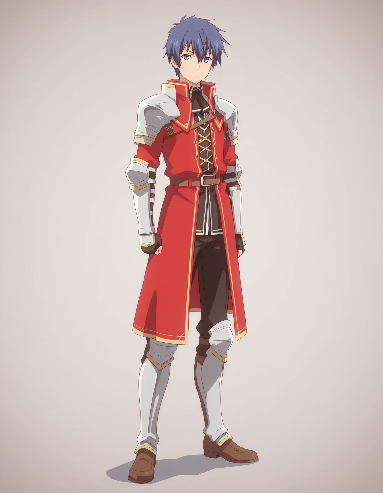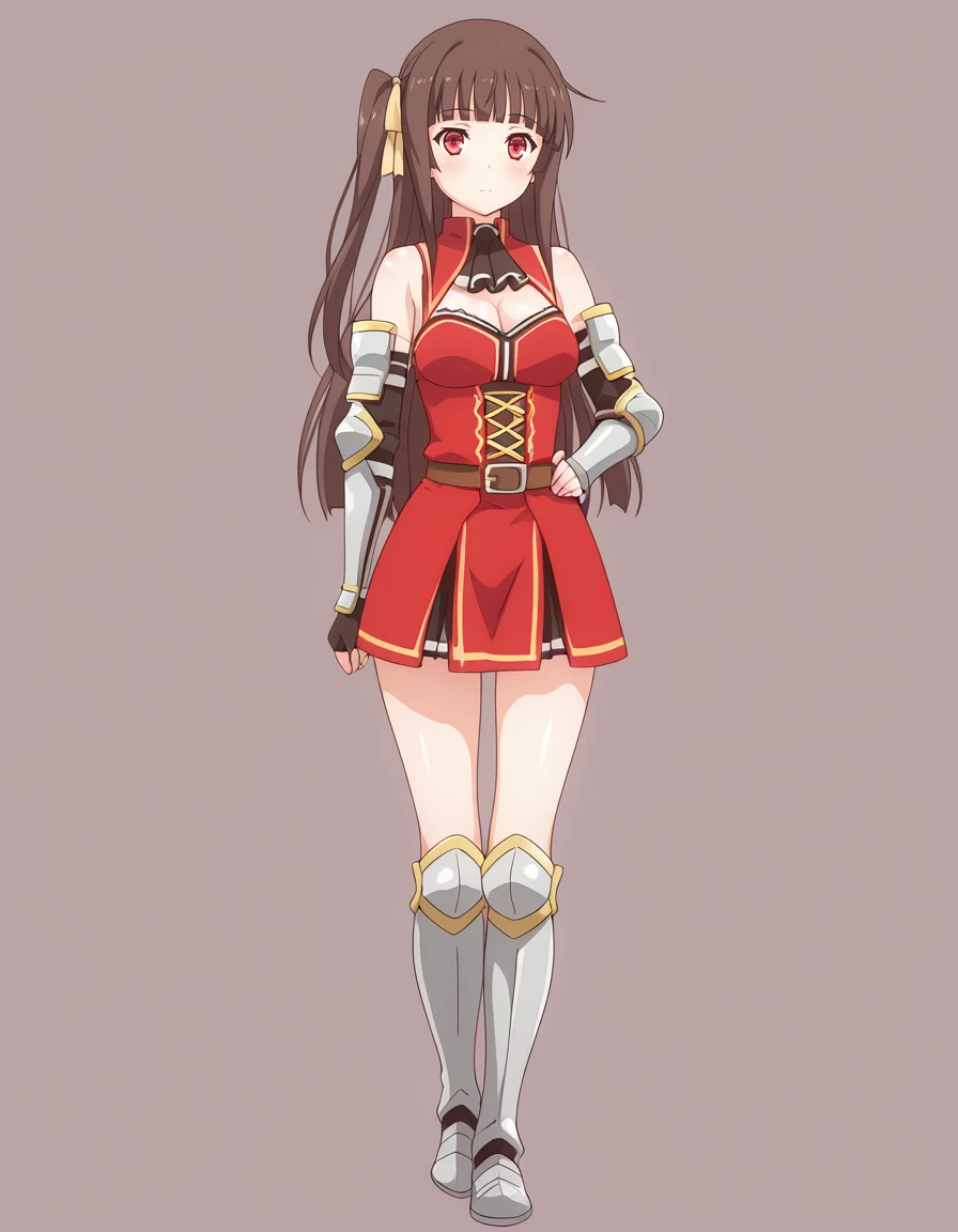 mai_kpk,mai_manakp,long_hair,blunt_bangs,one_side_up,brown_hair,red_eyes,medium_breasts,hair_ribbon,yellow_ribbon,bare_shoulders,elbow_gloves,ascot,cleavage_cutout,armor,armor_boots