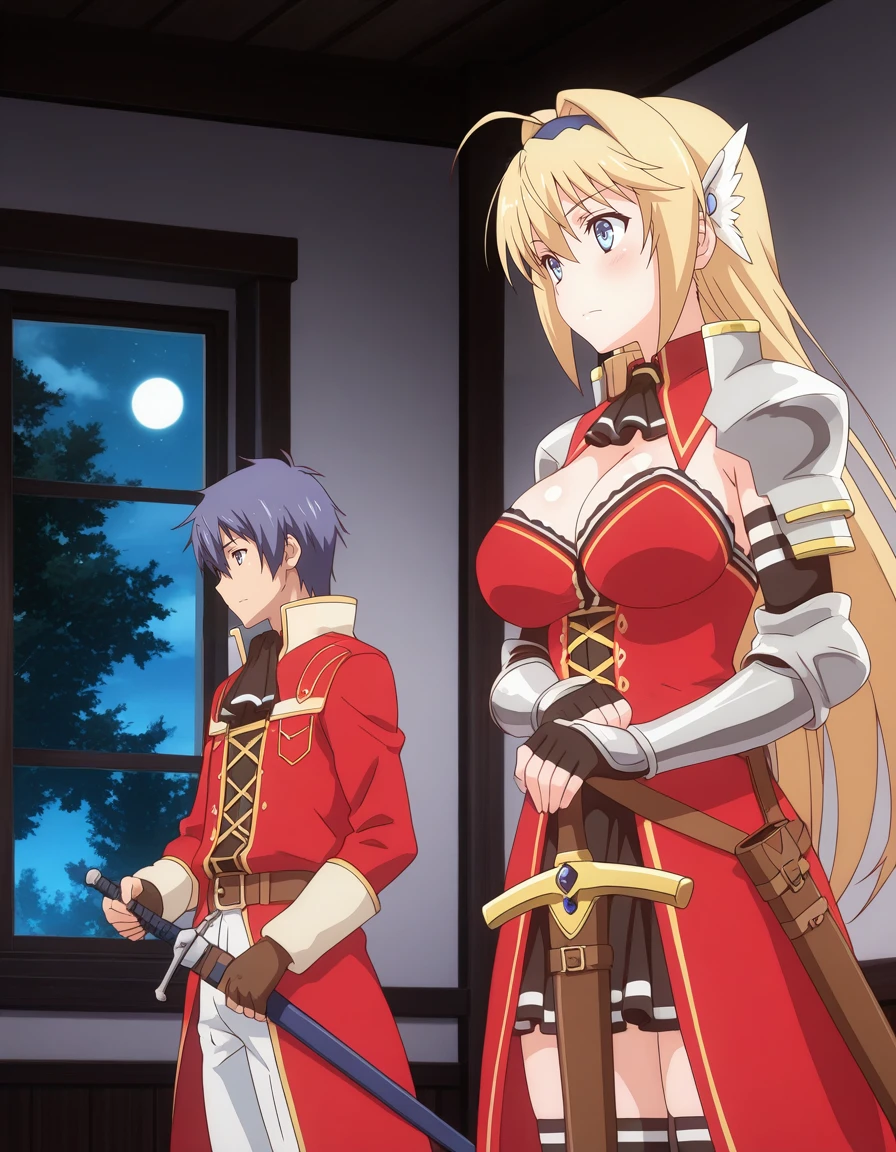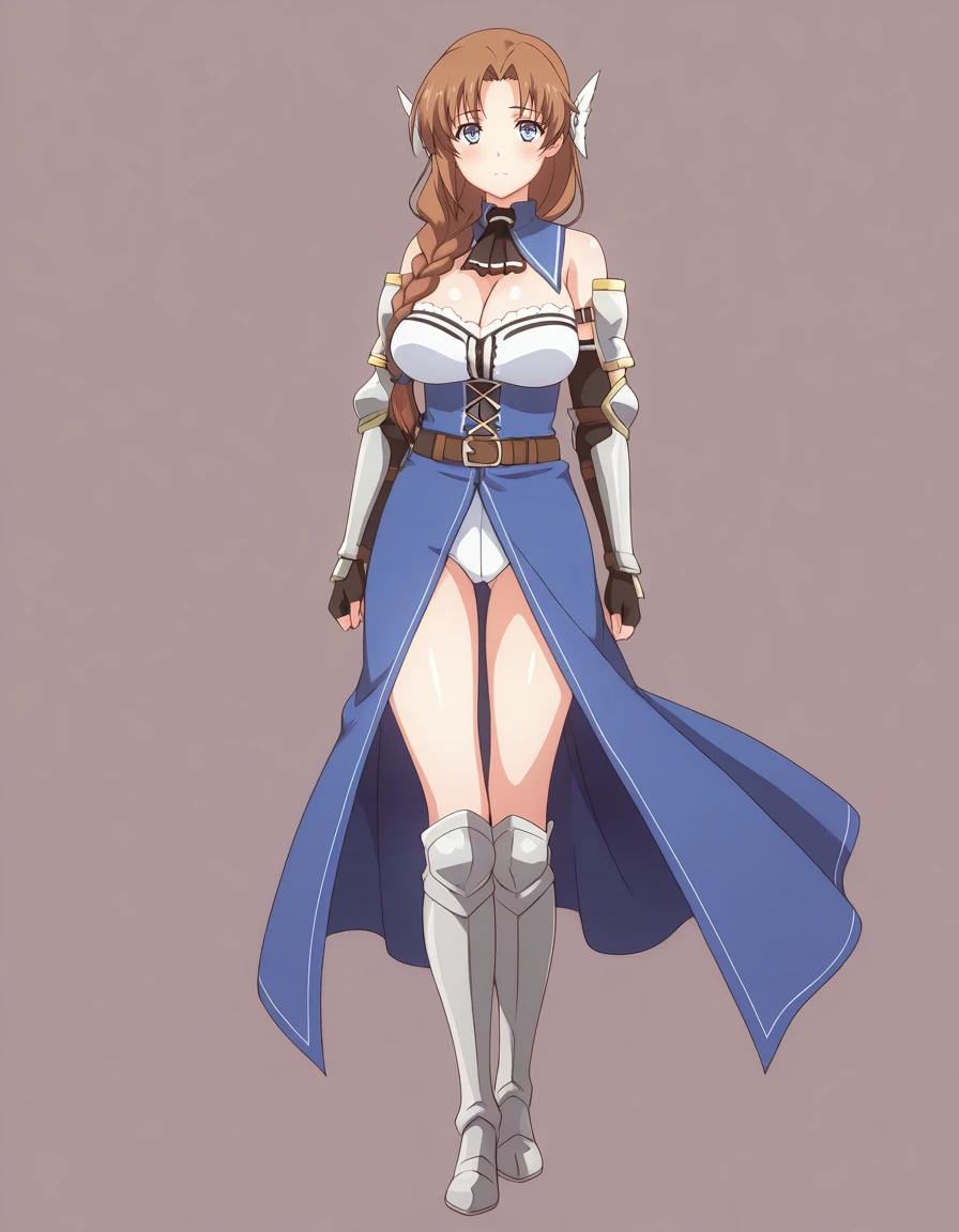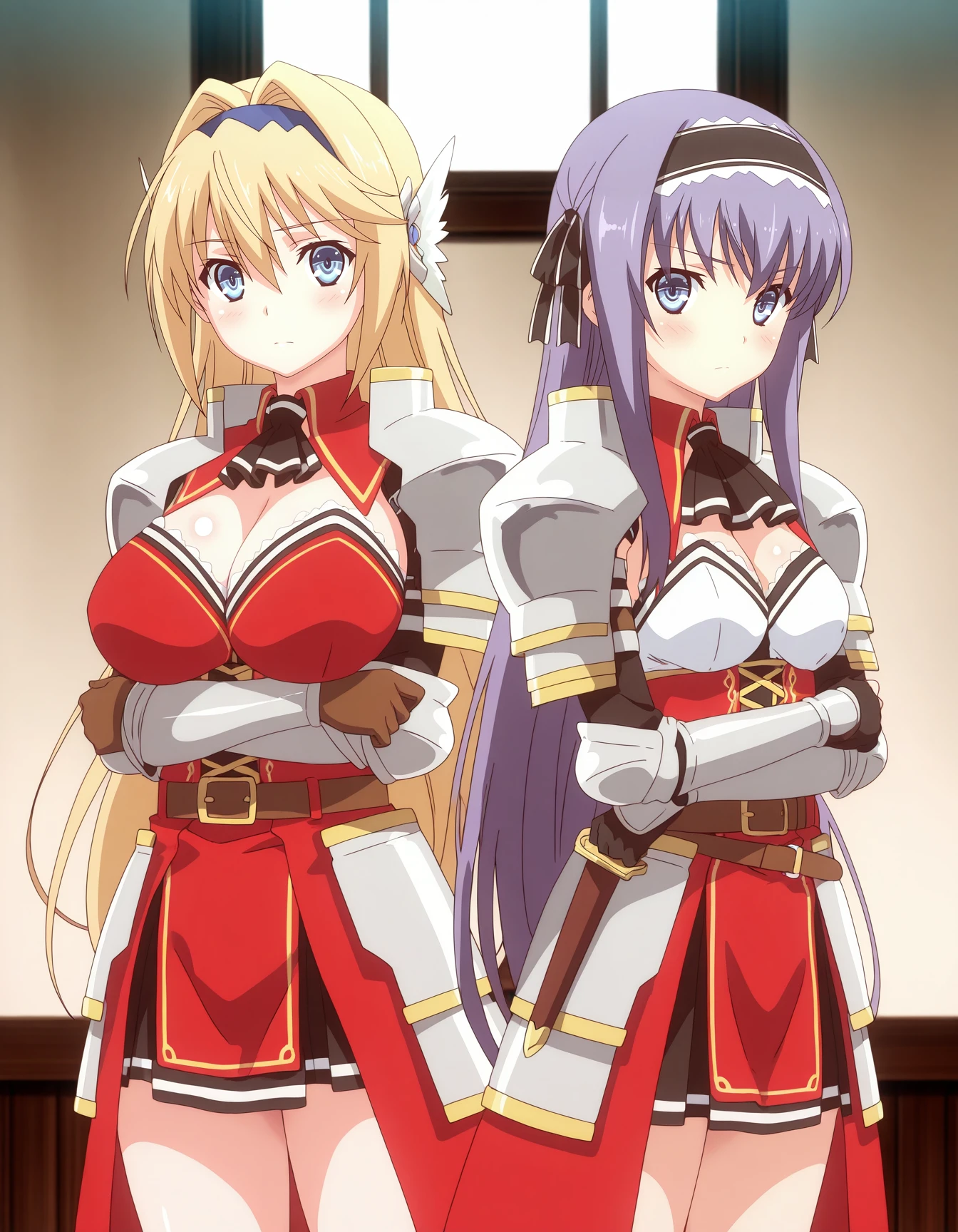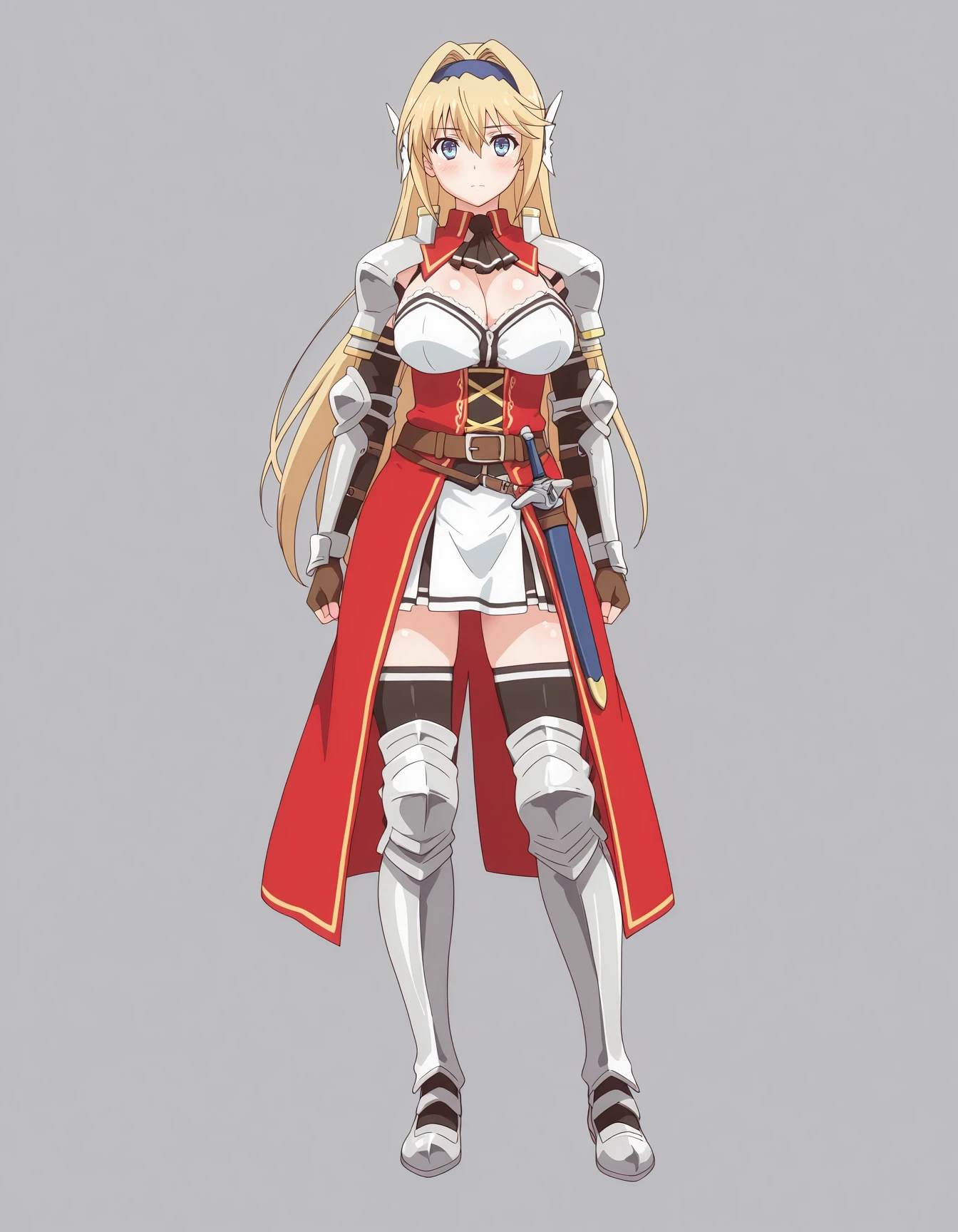 mai_kpk,mai_eliciakp,long_hair,hair_intakes,blonde_hair,blue_eyes,hair_between_eyes,large_breasts,hairband,armor,ascot,shoulder_pads,shoulder_armor,fingerless_gloves,brown_gloves
