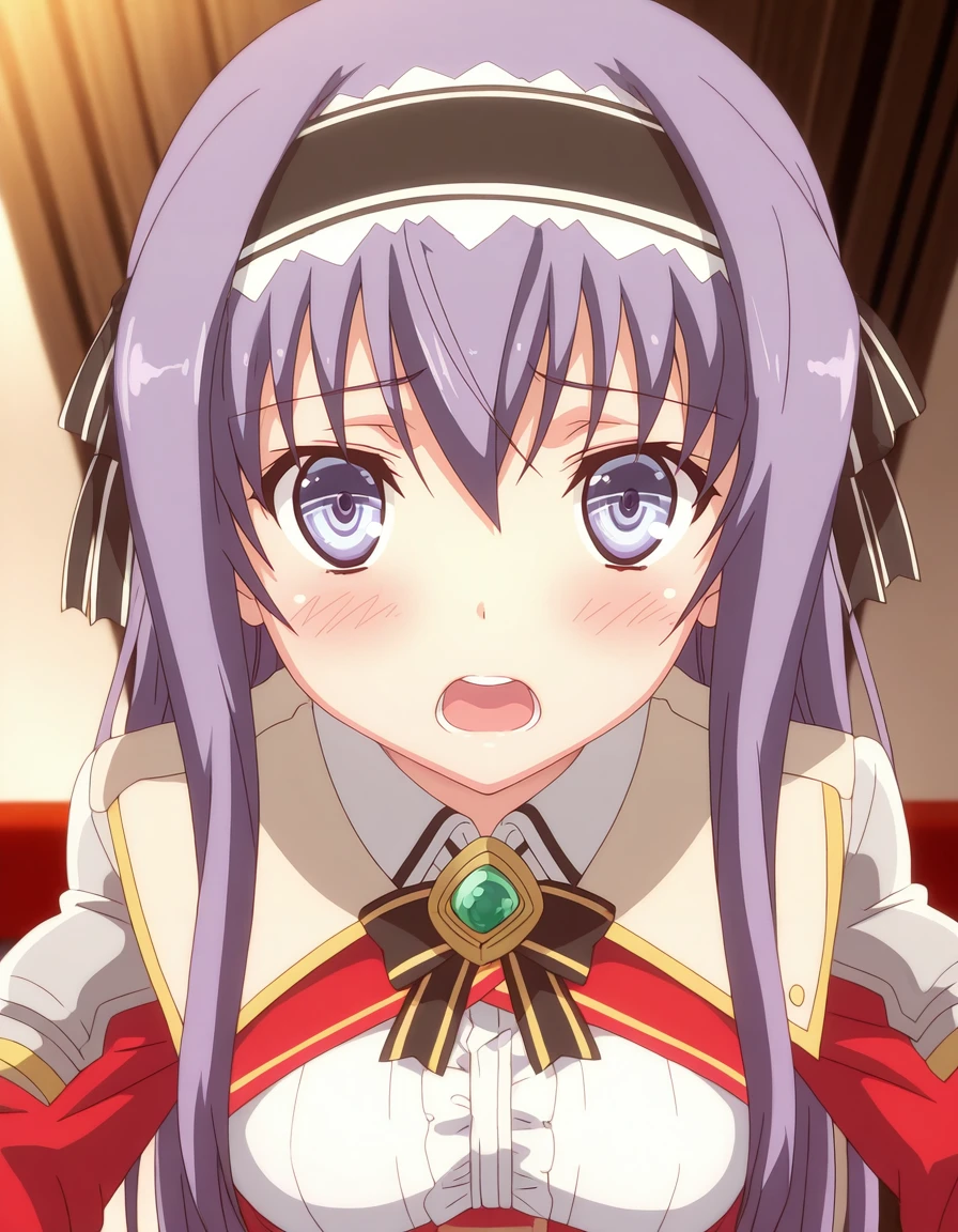 mai_kpk,mai_yuukp,very_long_hair,purple_hair,purple_eyes,hair_ribbon,medium_breasts,armor,shoulder_armor,pauldrons,black_ascot