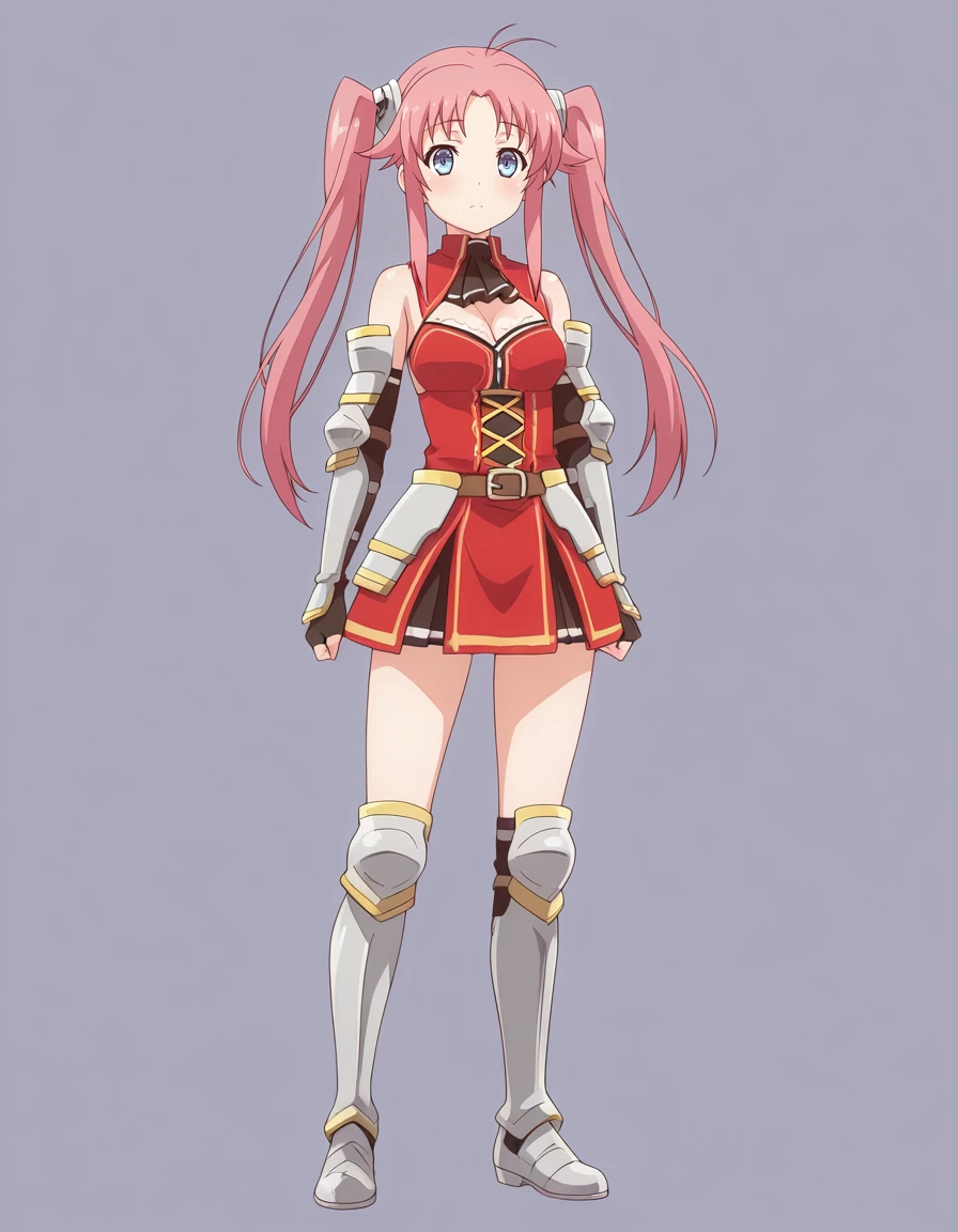 mai_kpk,mai_akarikp,long_hair,hair_ornament,twintails,pink_hair,sidelocks,medium_breasts,bare_shoulders,elbow_gloves,ascot,cleavage_cutout,armor,armor_boots