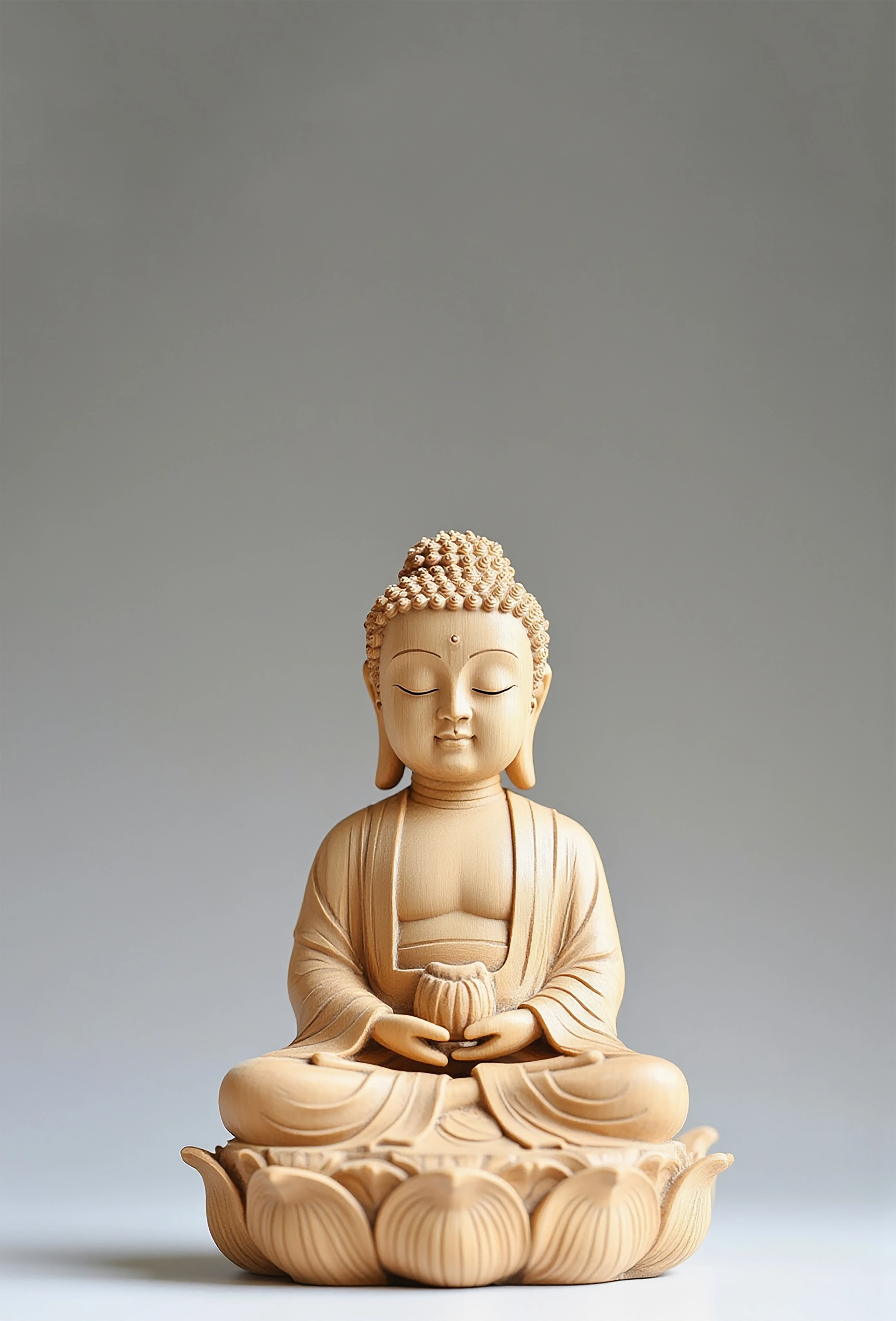 Recommended prompt form: mudiao, huangyangmudiao, The image is a photograph of a statue of aseated Buddha The statue is made of a light-colored material and is intricately carved with a floral design around the base The Buddha is depicted in a meditative pose, with his hands resting on his lap and his eyes closed