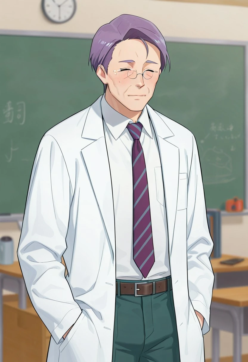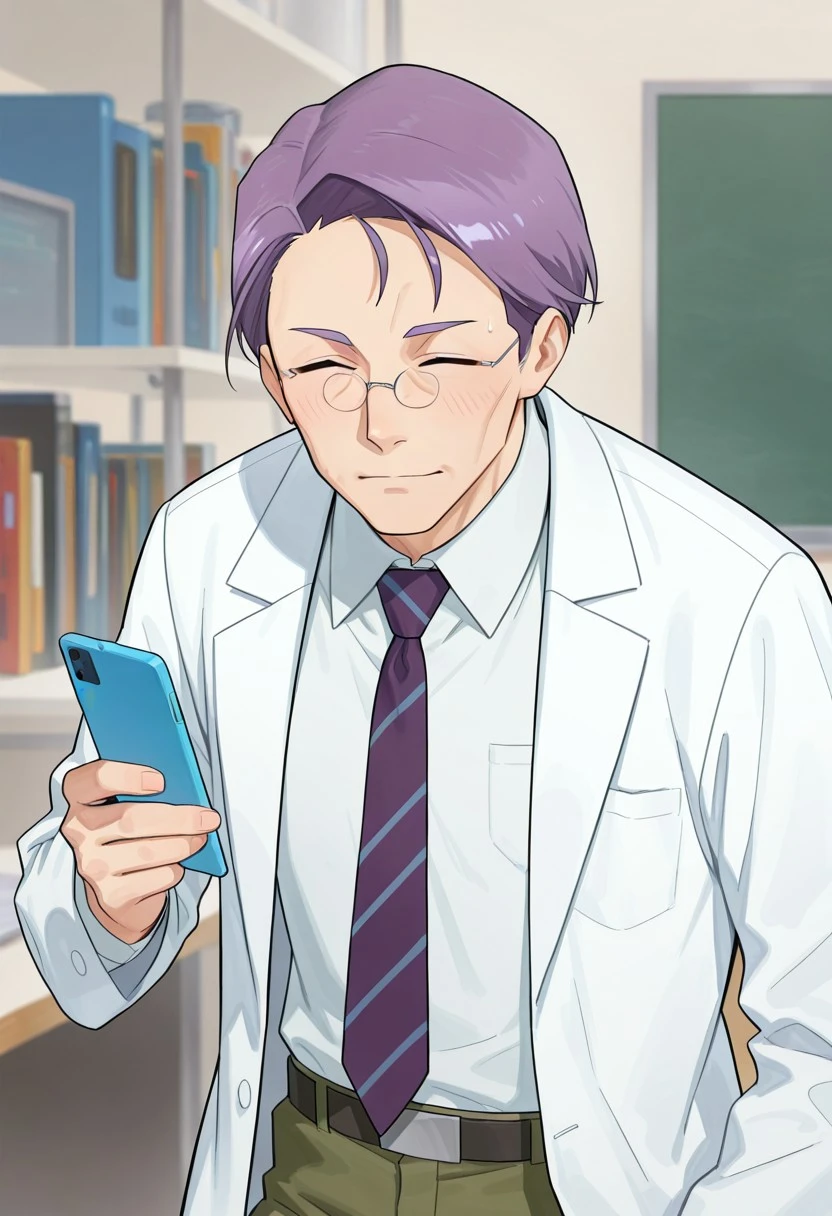 <lora:Soujiro Kominami BWBGD-V1>,SoujiroKominamiBWBGD, light purple hair, short hair, eyes closed, glasses, oval glasses