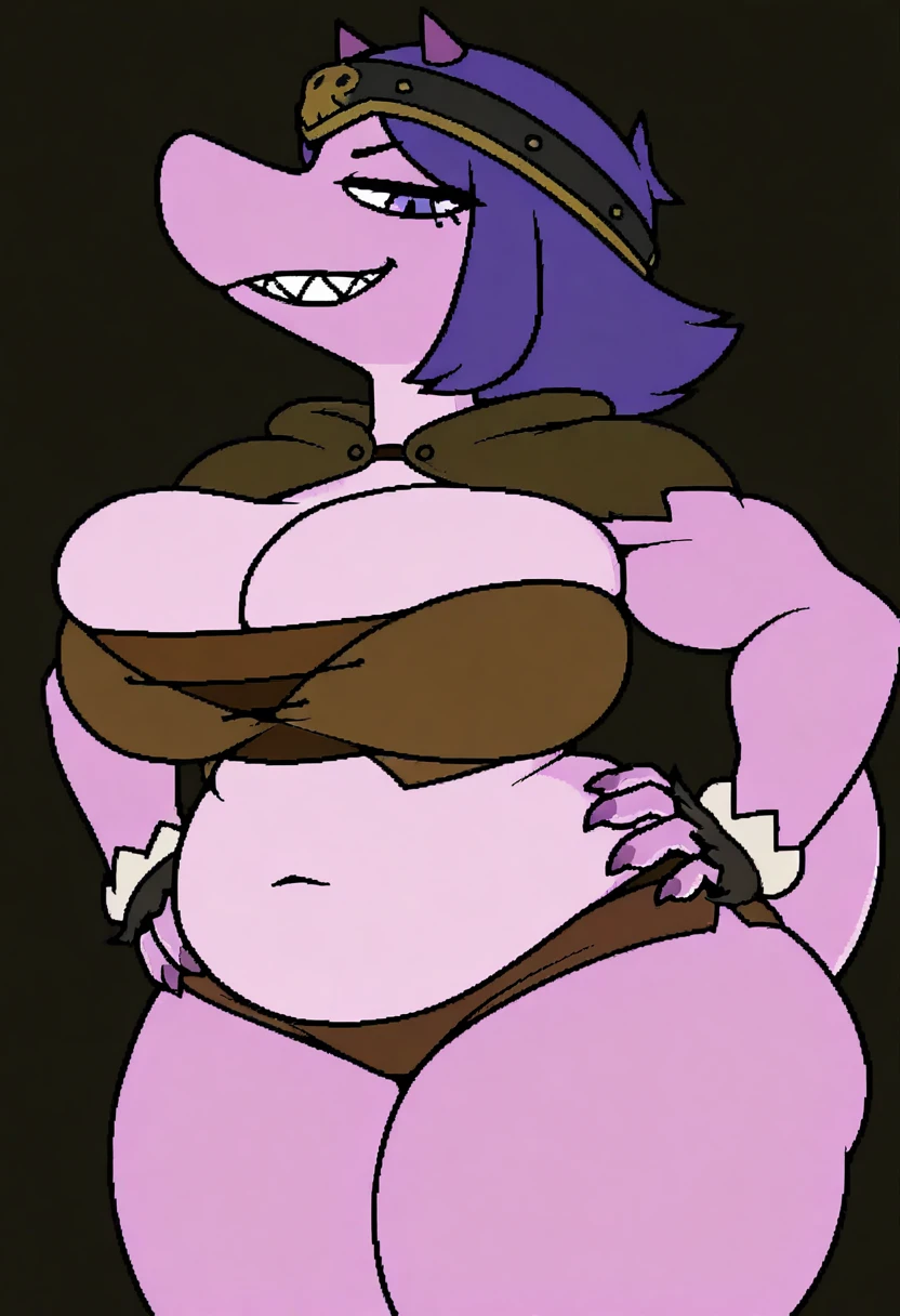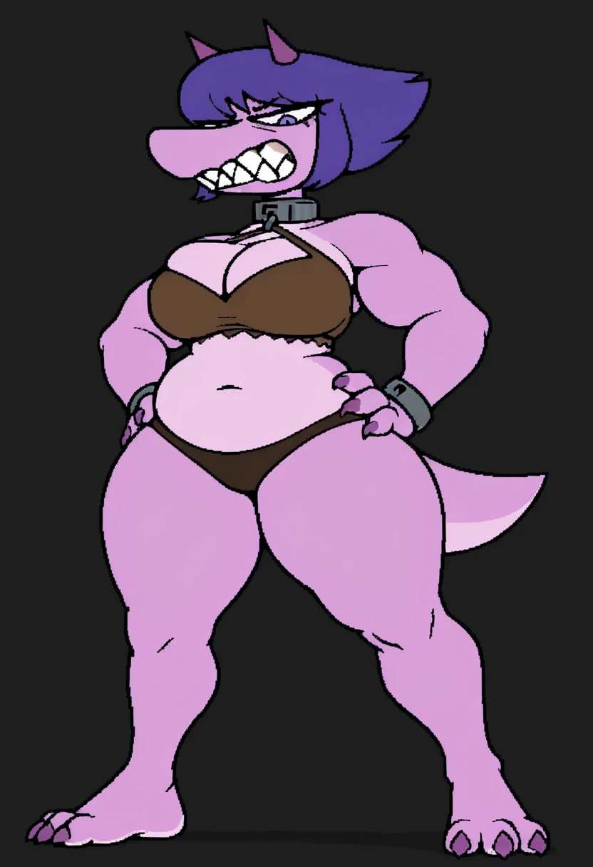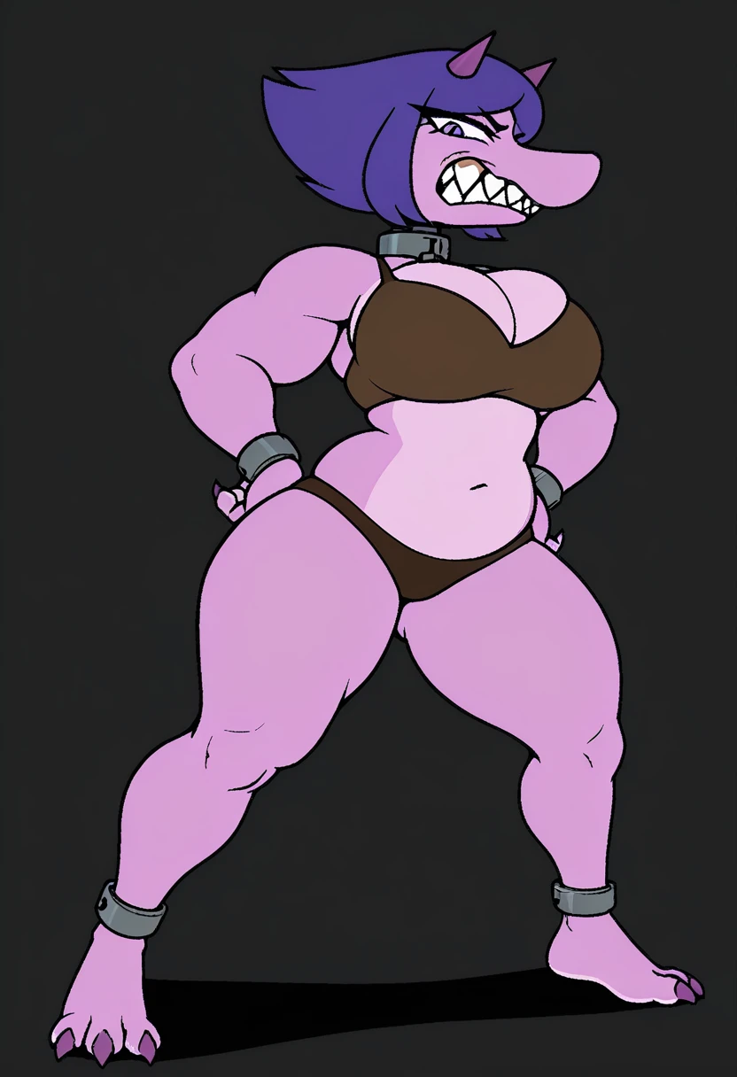 Dragoness, two tone body, pink skin, short purple hair, purple eyes, claws, horns, muscular