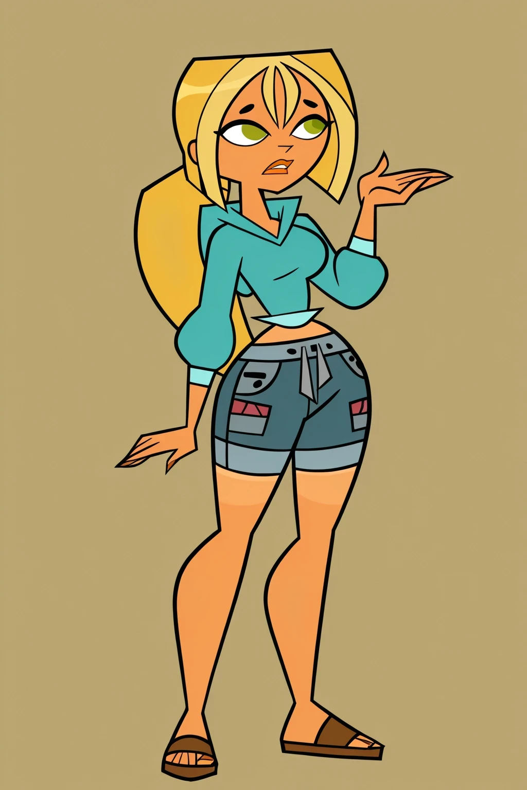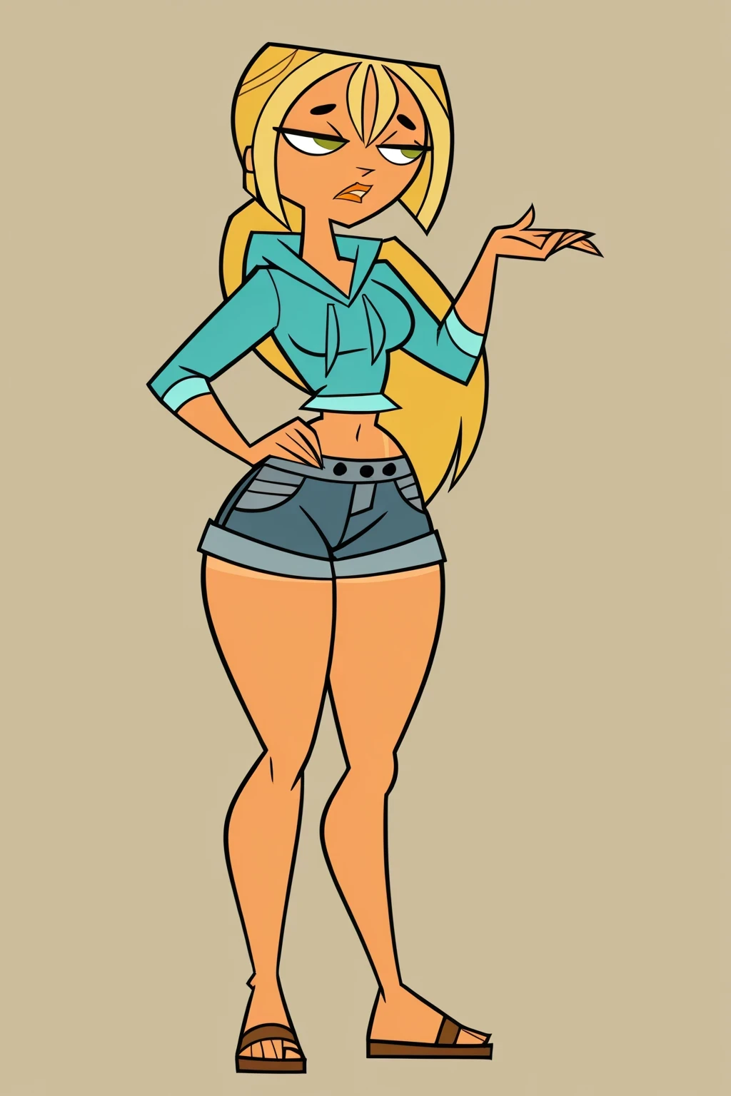BridgetteTDI, 1girl, blonde hair in a ponytail, fairly tanned skin, olive green eyes, turquoise blue pullover hoodie, blue-gray drawstring denim shorts, brown sandals, orange lips, lipstick, bridgette (total drama),