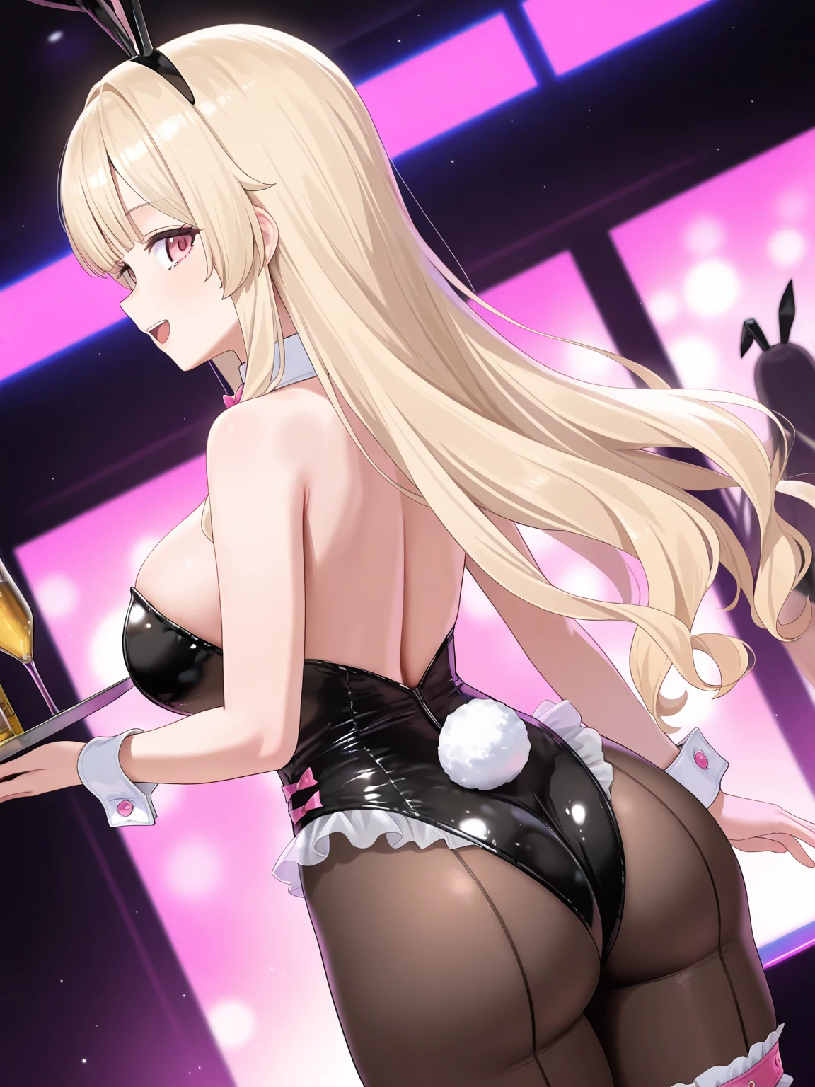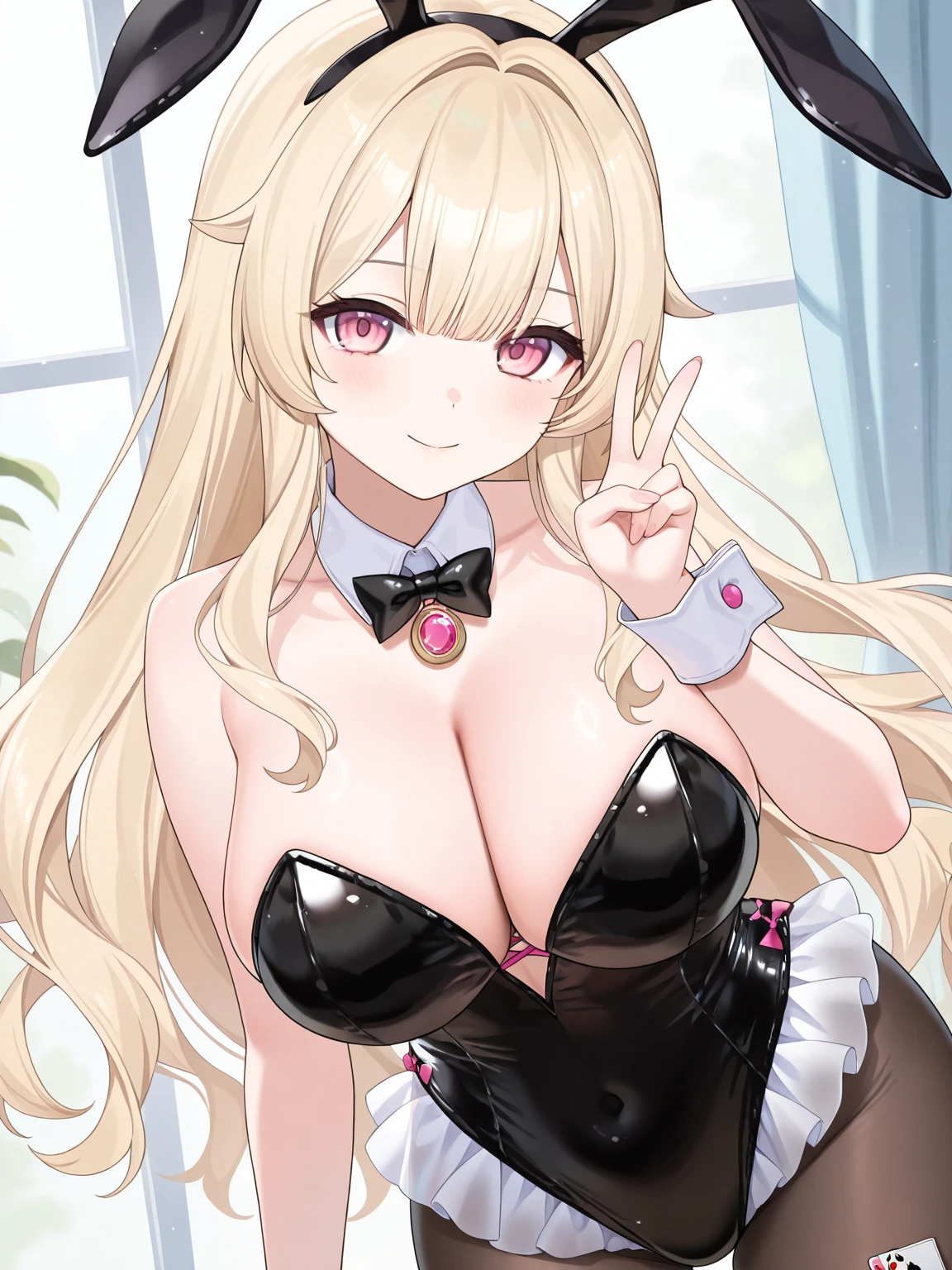 Pink Bunnysuit: pink bunny suit, bunny girl, latex, frilled trim, bowtie, white cuffs, wrist cuffs, white pantyhose, animal ears, bow, detached collar, rabbit ears, cleavage, long hair, bowtie