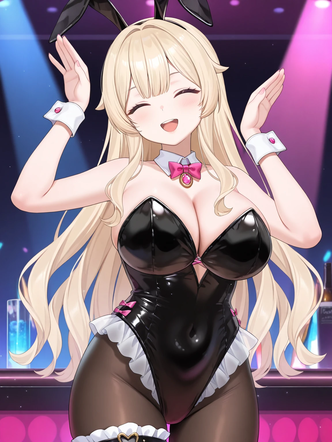 Black Bunnysuit: black bunny suit, bunny girl, latex, frilled trim, bowtie, white cuffs, wrist cuffs, black pantyhose, animal ears, bow, detached collar, rabbit ears, cleavage, long hair, bowtie