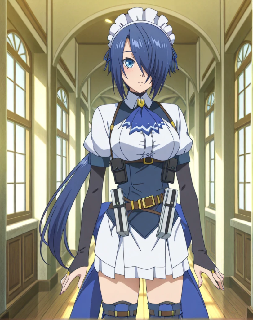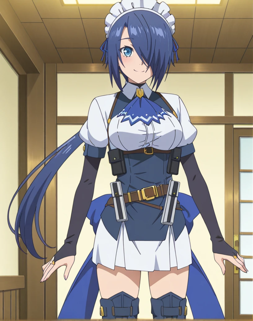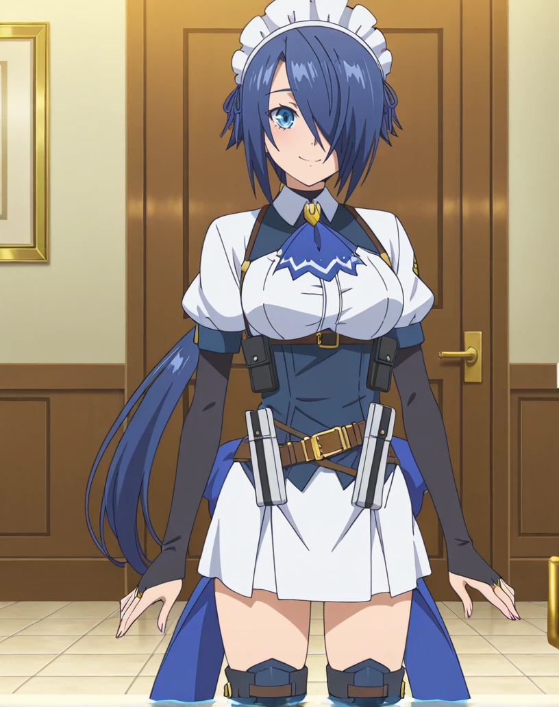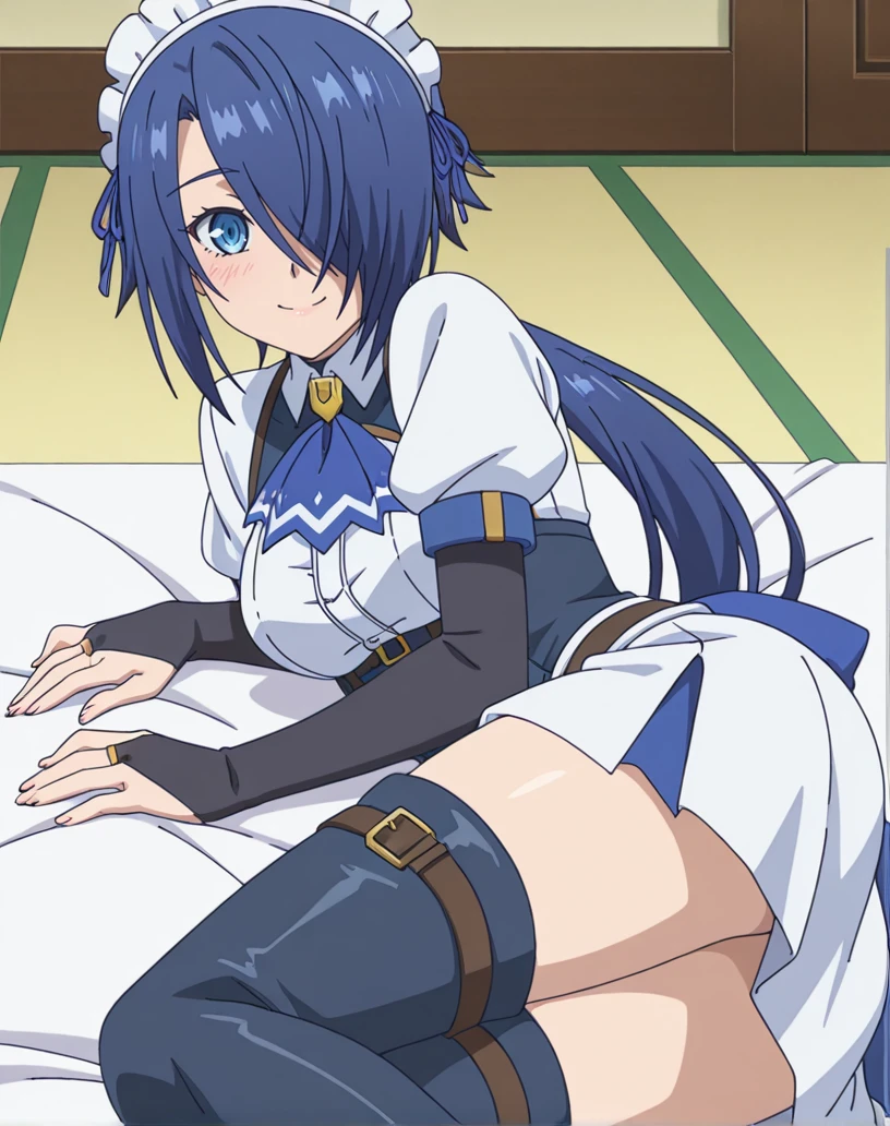 zoey (kizoku tensei), solo, 1girl, blue eyes, blue hair, long hair, low ponytail, hair over one eye, maid, maid headdress, ascot, short sleeves, bridal gauntlets, ribbon, white shirt, white skirt, thigh boots