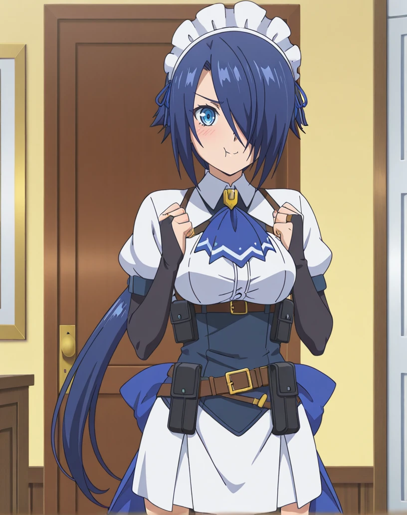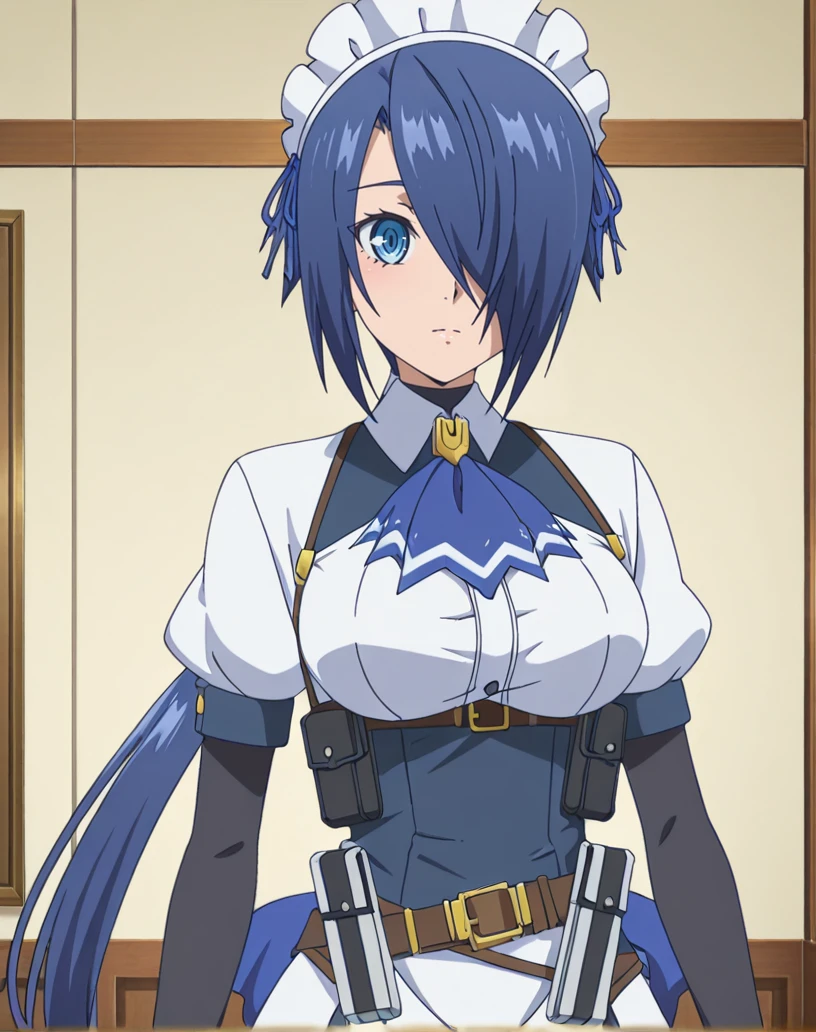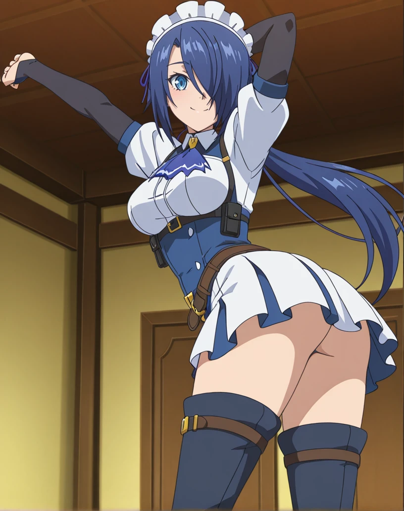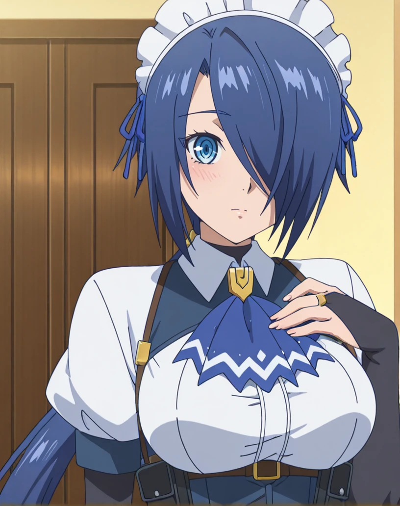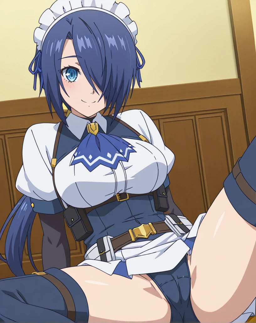 zoey (kizoku tensei), solo, 1girl, blue eyes, blue hair, long hair, low ponytail, hair over one eye, maid, maid headdress, ascot, short sleeves, bridal gauntlets, ribbon, white shirt, white skirt, thigh boots