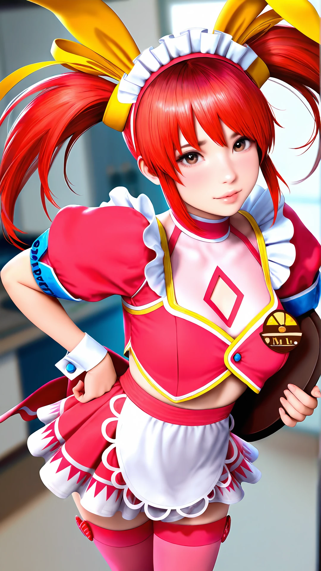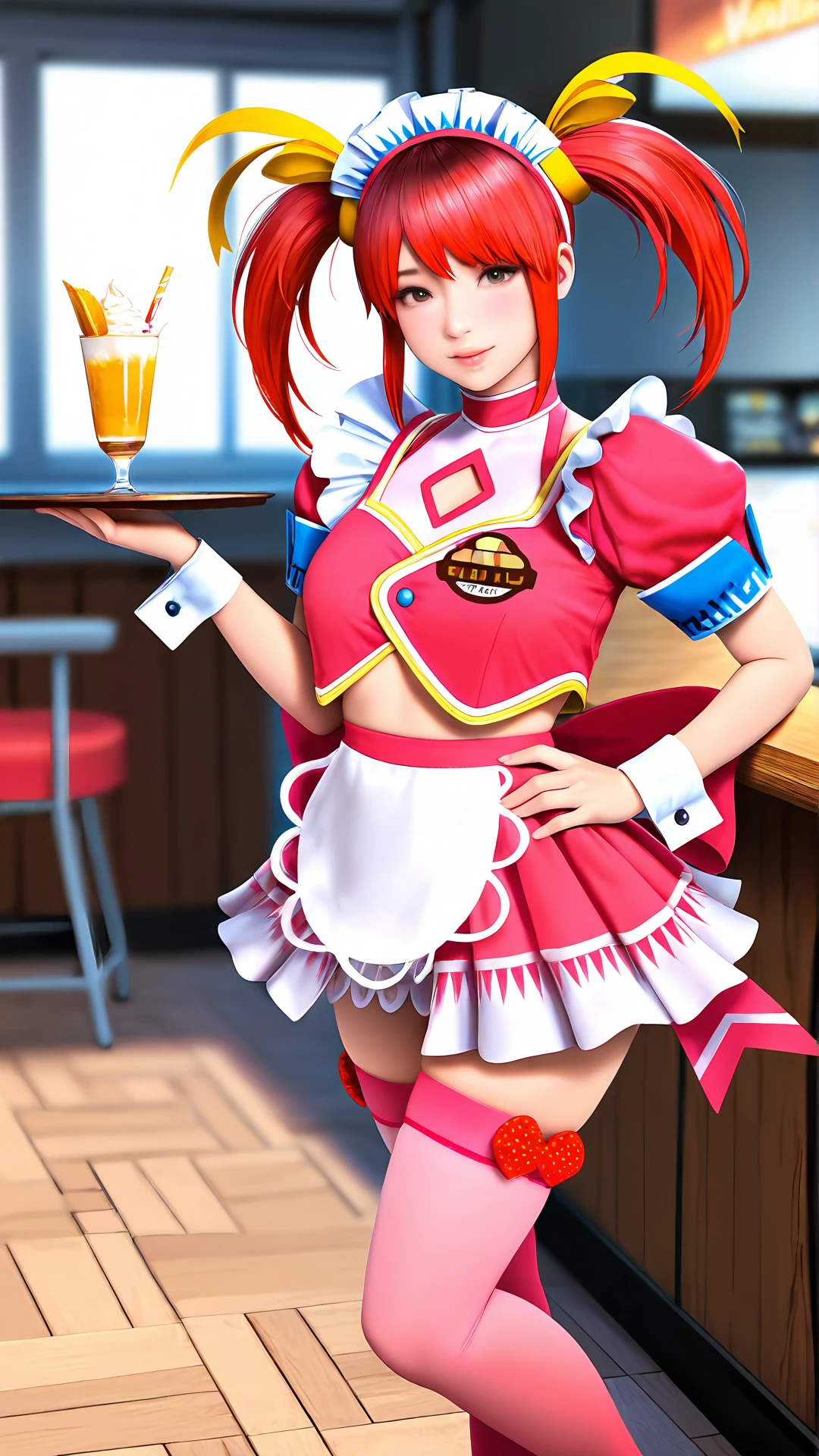 fujikawamayu,1girl,solo,pink thighhighs,twintails,waitress,skirt,red hair,wrist cuffs,realistic,game cg,photorealistic,