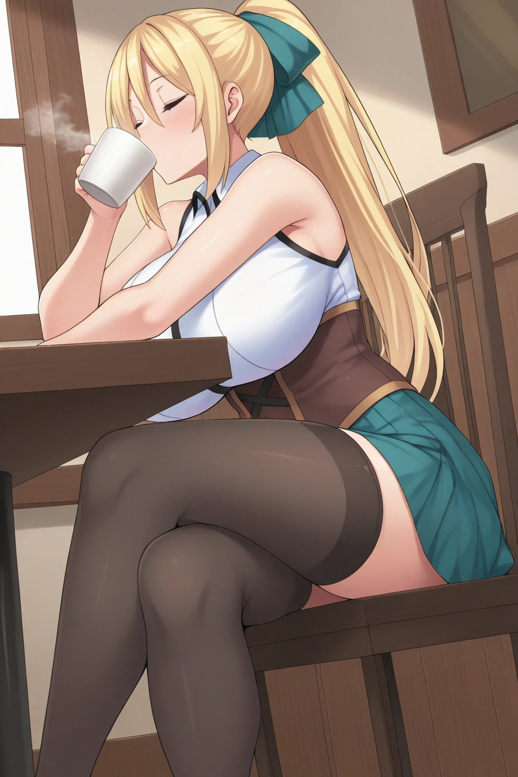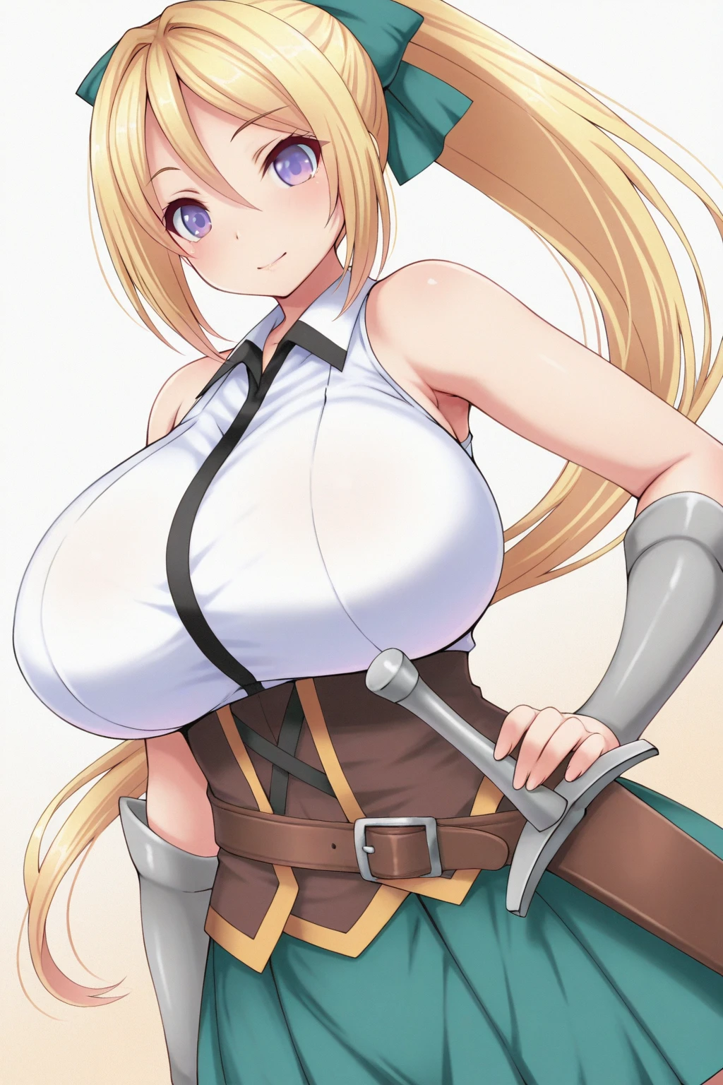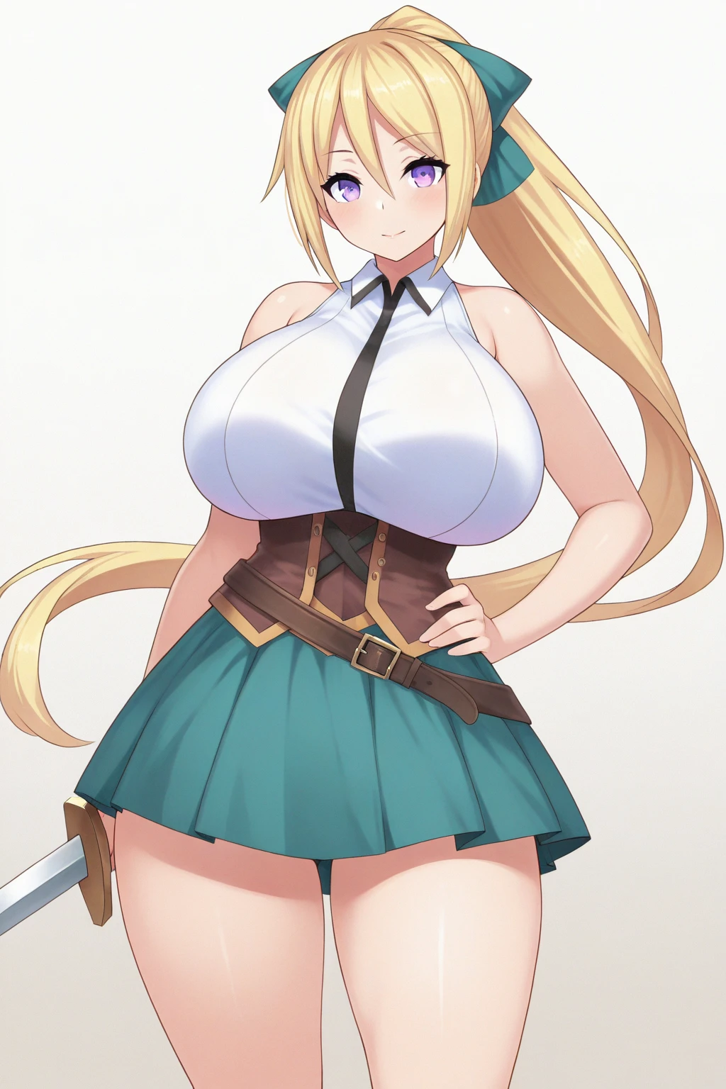 FRSasha, huge breasts, long hair, ponytail, blonde hair, hair between eyes, green bow, hair ribbon, white shirt, bare shoulders, sleeveless, pleated skirt, corset, brown corset, green skirt, belt, sword, , sheathed