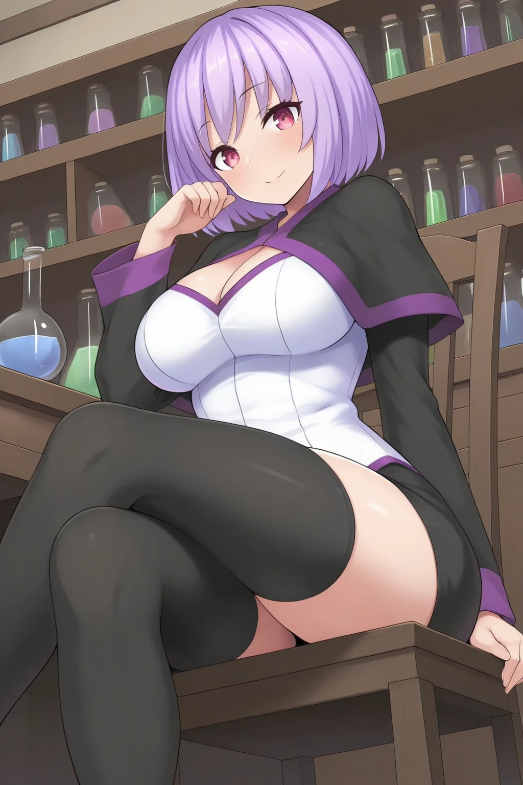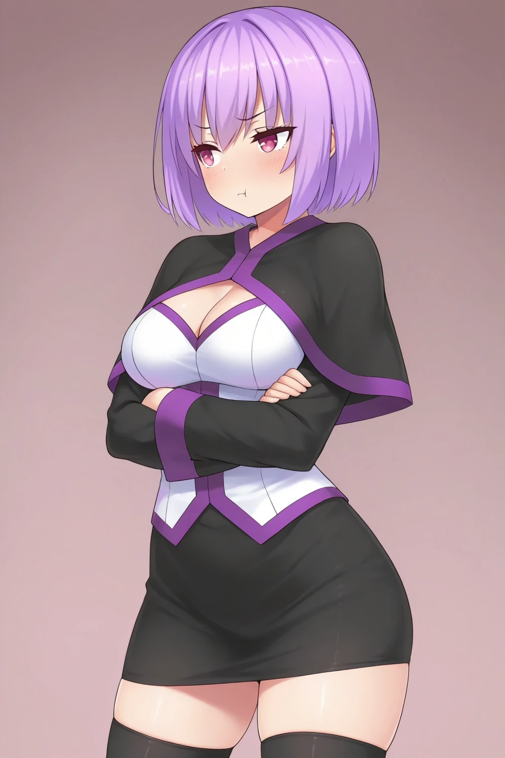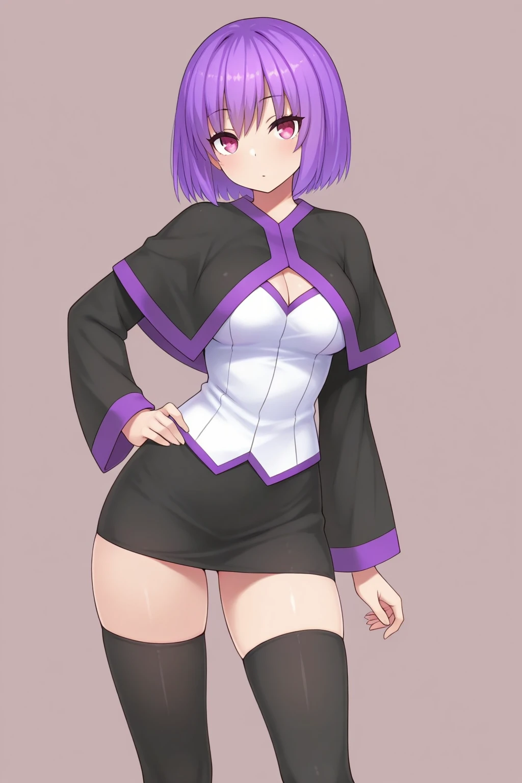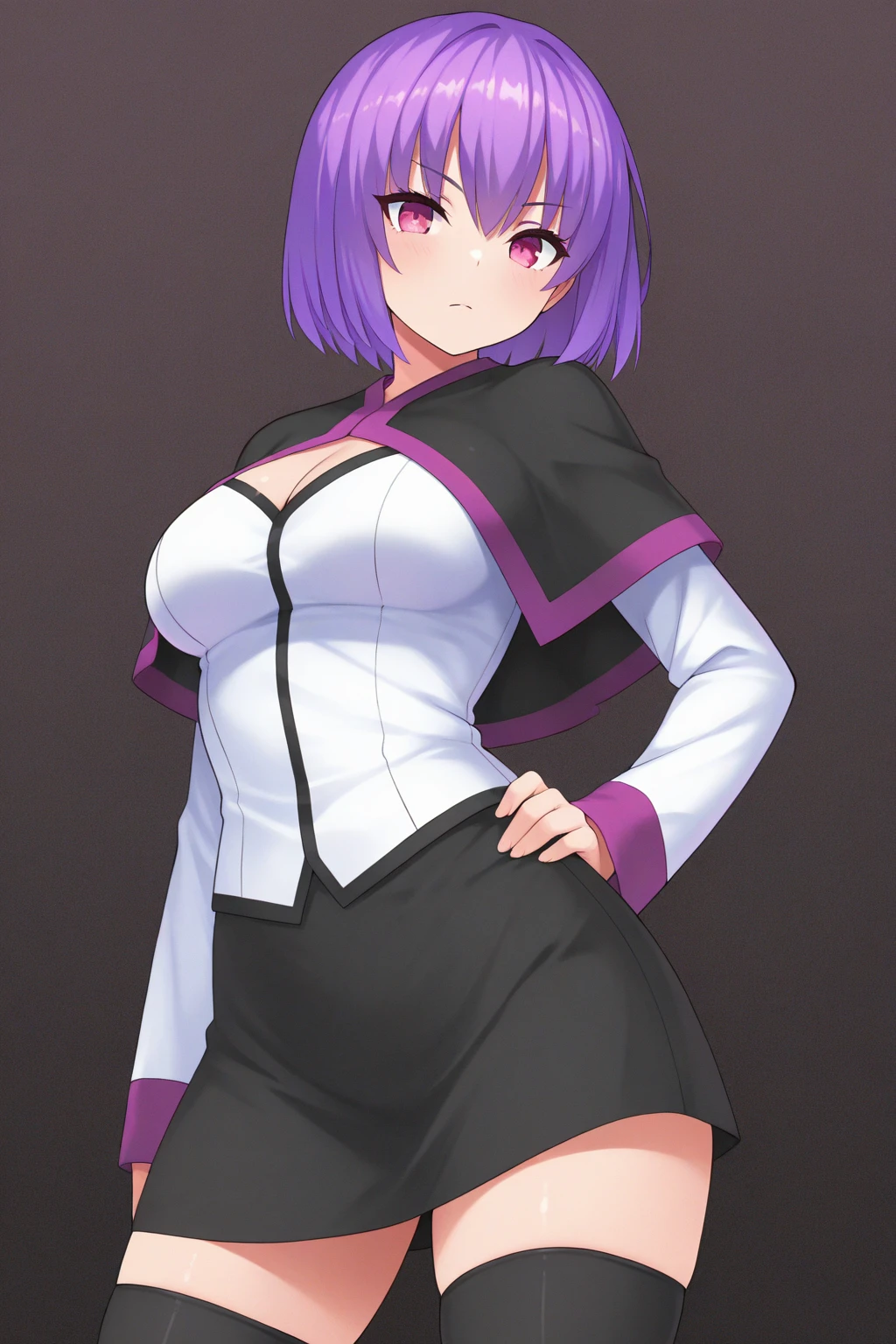 FRSiena, medium breasts, pink eyes, short hair, purple hair, cleavage, black capelet, white shirt, purple trim, long sleeves, black sleeves, miniskirt, black skirt, zettai ryouiki, black thighhighs