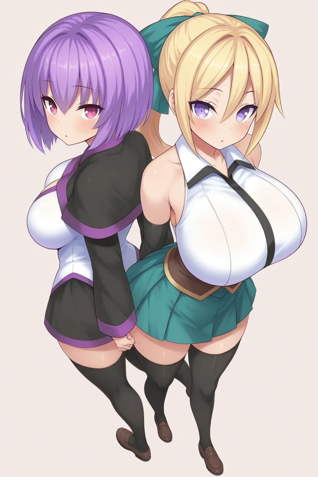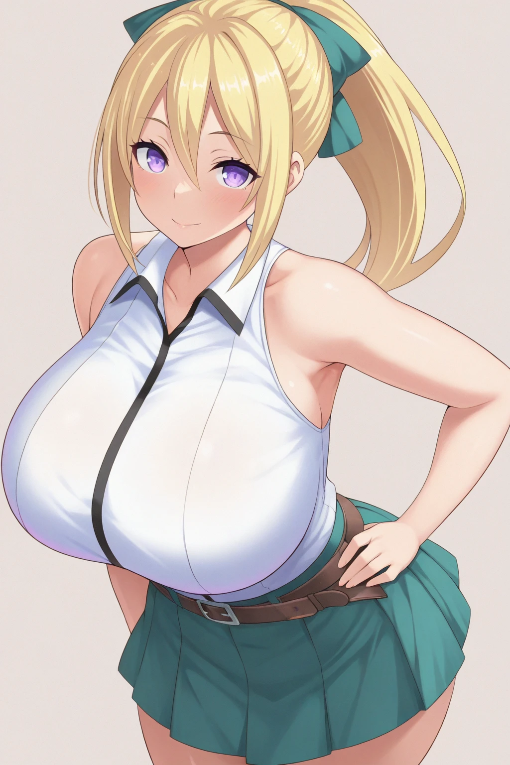 Sasha: FRSasha, huge breasts, long hair, ponytail, blonde hair, haid between eyes, green bow, hair ribbon, white shirt, bare shoulders, sleeveless, pleated skirt, corset, brown corset, green skirt, belt
