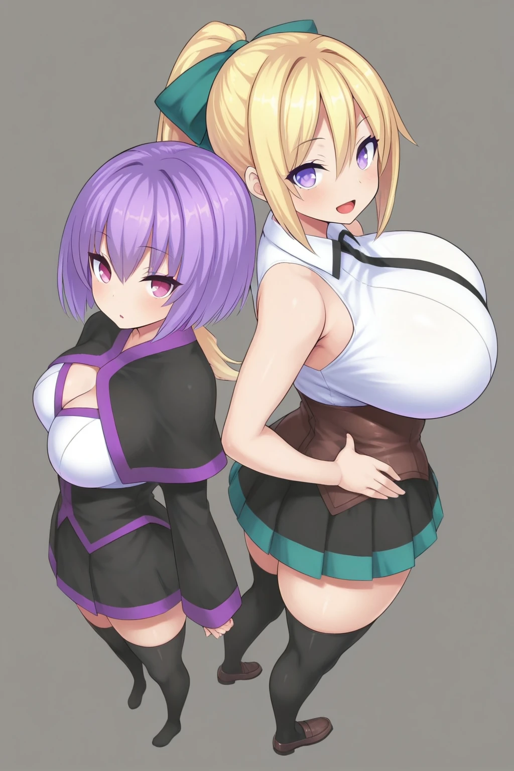 Siena: FRSiena, medium breasts, pink eyes, short hair, purple hair, cleavage, black capelet, white shirt, purple trim, long sleeves, black sleeves, miniskirt, black skirt, zettai ryouiki, black thighhighs