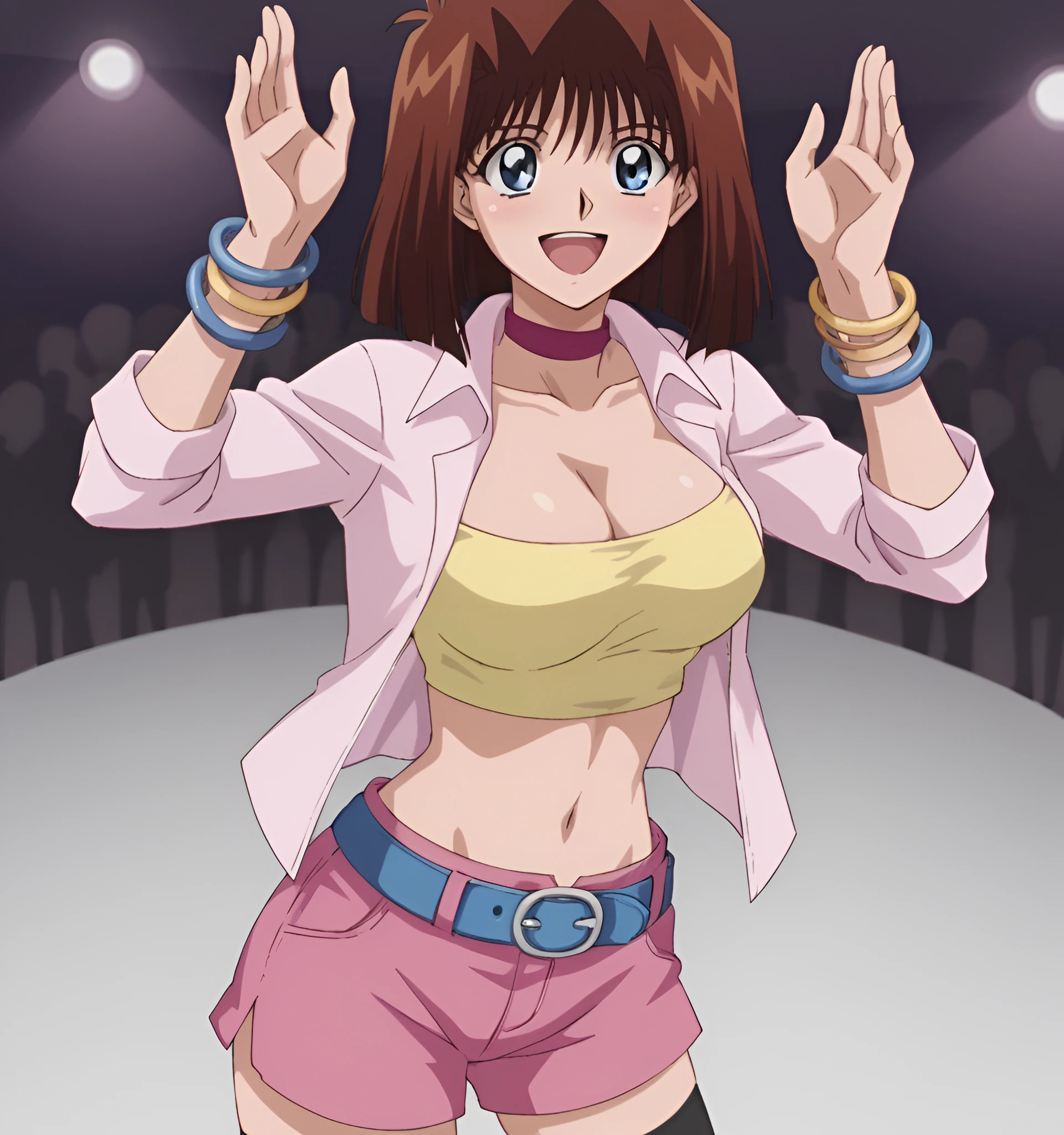 blue and pink bracelet, yellow strapless tube top, pink shorts, blue belt, red platform sandals, pink choker, black thigh-high, black stockings, pink jacket, yellow bag