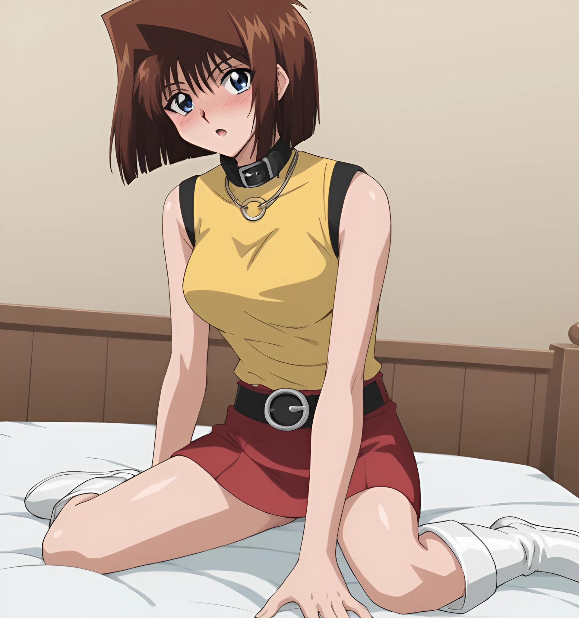 yellow turtleneck shirt ,black collar, sleeveless, black sleeveless shirt, red skirt, metal circle necklace, black belt, white boots, yellow briefcase