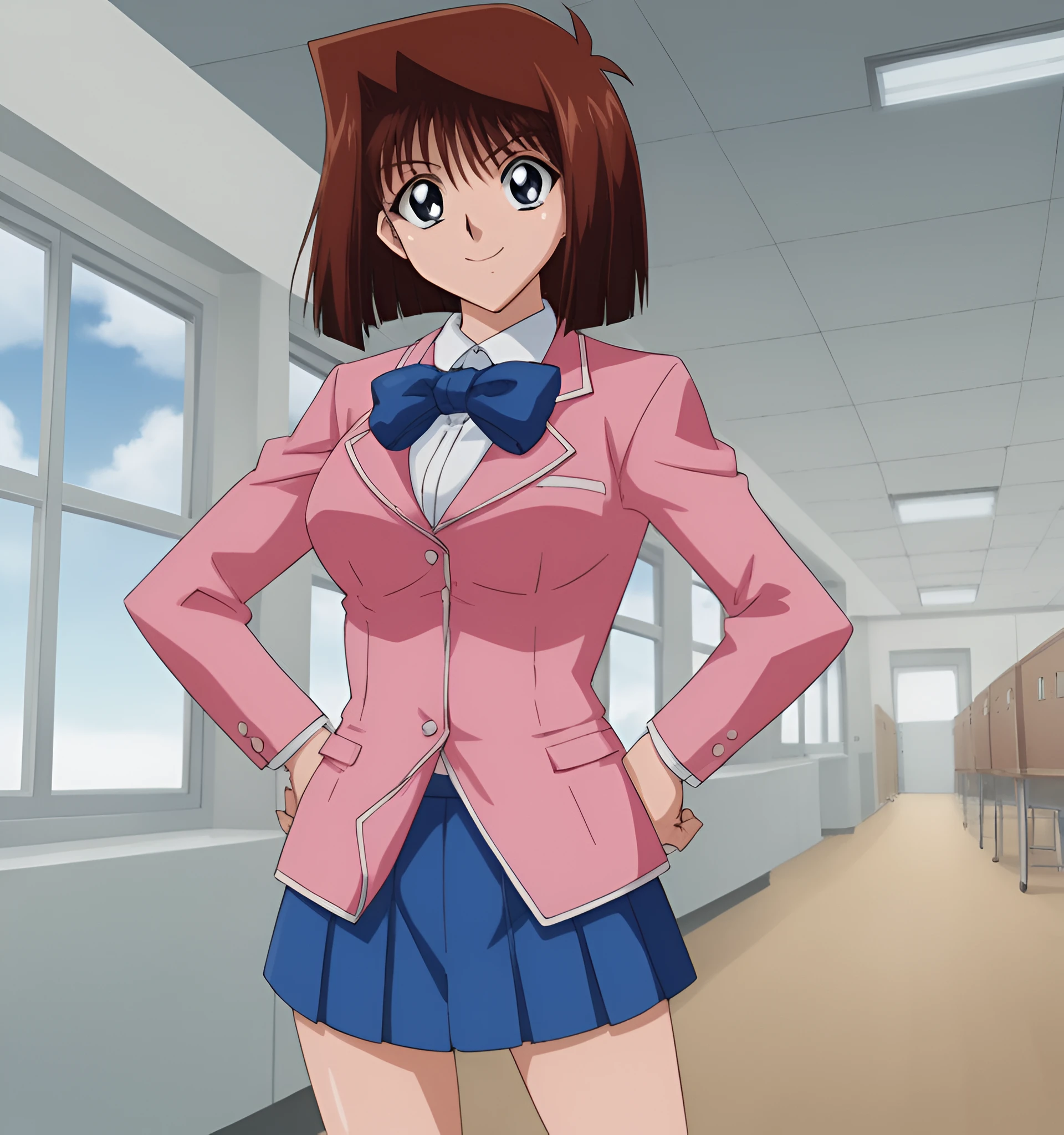 school uniform, blue bowtie, pink jacket, blazer, long sleeves, blue skirt, pleated skirt