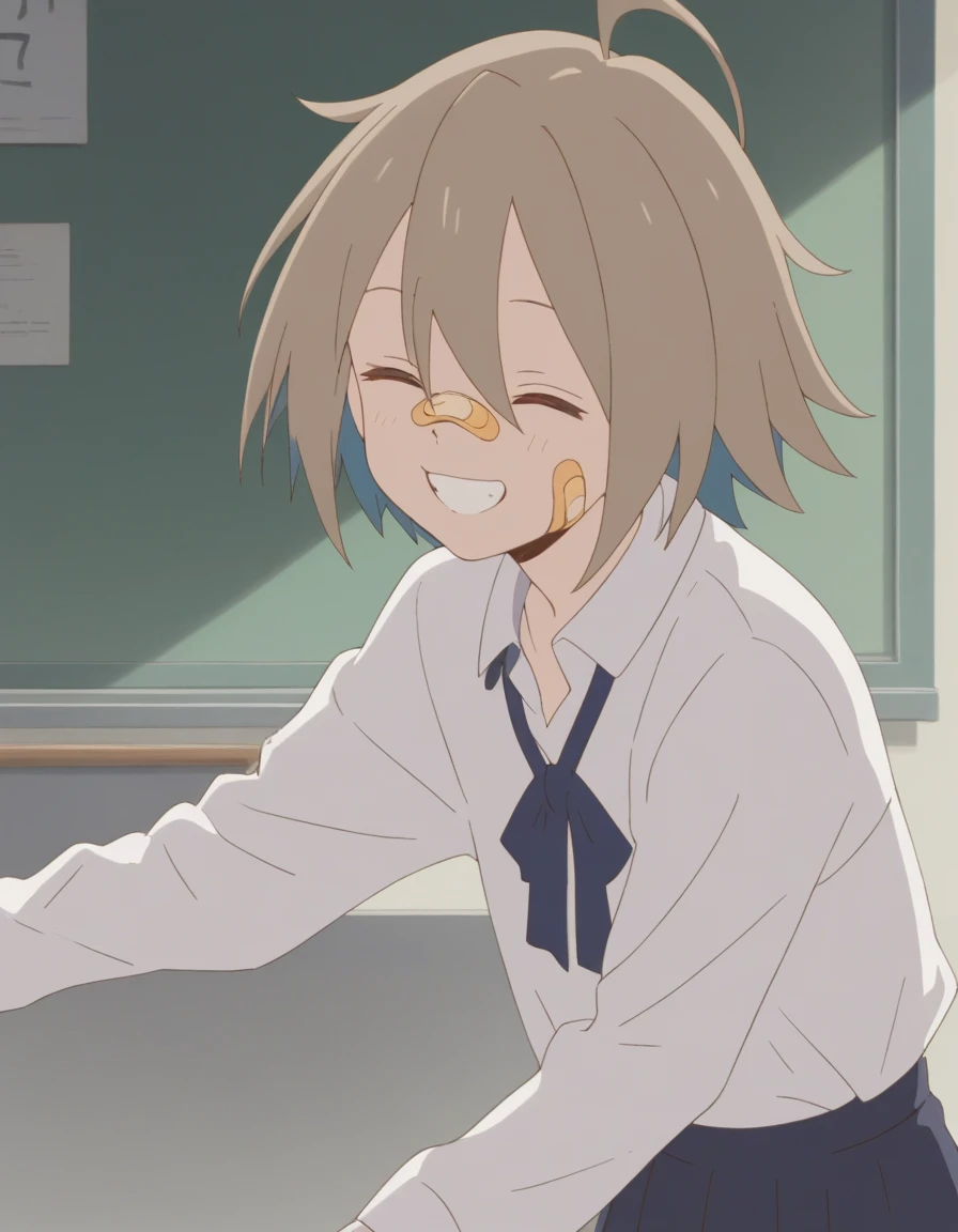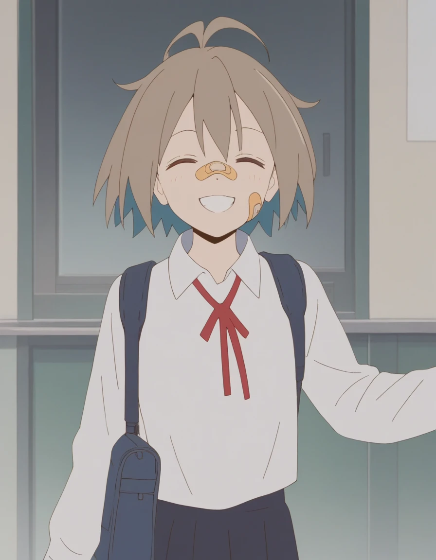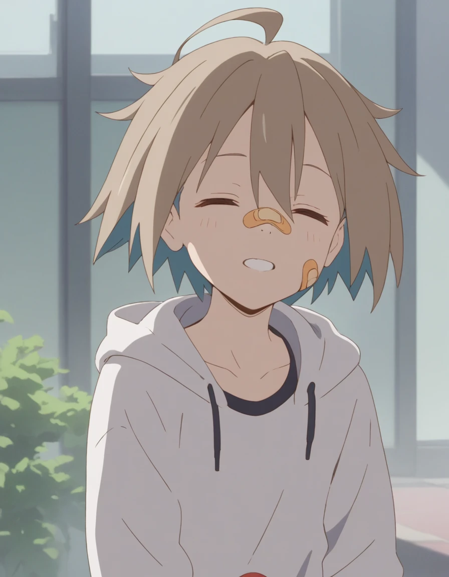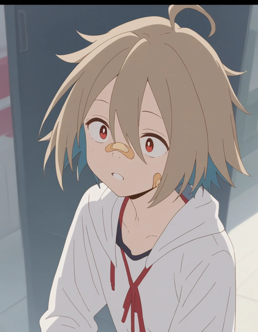 self, short hair, bandaid, ahoge, bandaid on face, bandaid on nose, red eyes