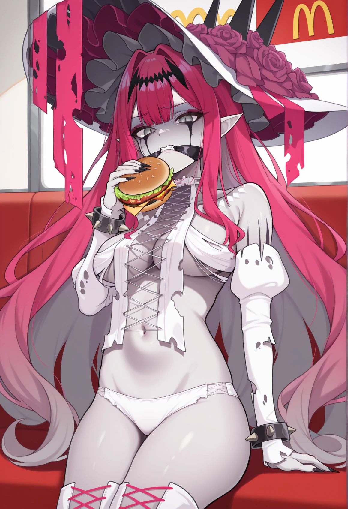 Vanilla3: pointy ears, pink hair, very long hair, grey eyes, hair ornament, hat, hair flower, Cross-Laced Clothes, Cross-Laced footwear, torn clothes, long sleeves, detached sleeves, panties, sharp fingernails, spiked bracelet, facial mark, gag,